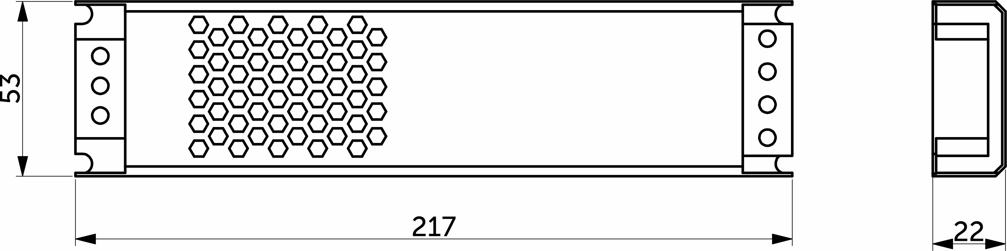 Размеры 217х53х22 мм. Вх.напряж. 198-264V AC, вых.напряж. 12V DC, мощность 150Вт, сила тока 12,5A, степень защиты IP20.
