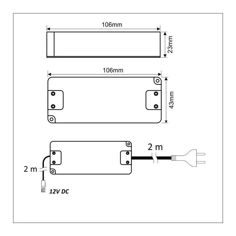 Размеры 105х43х23 мм, длина кабеля от блока к вилке 2 м, от блока к мини-коннектору 2 м