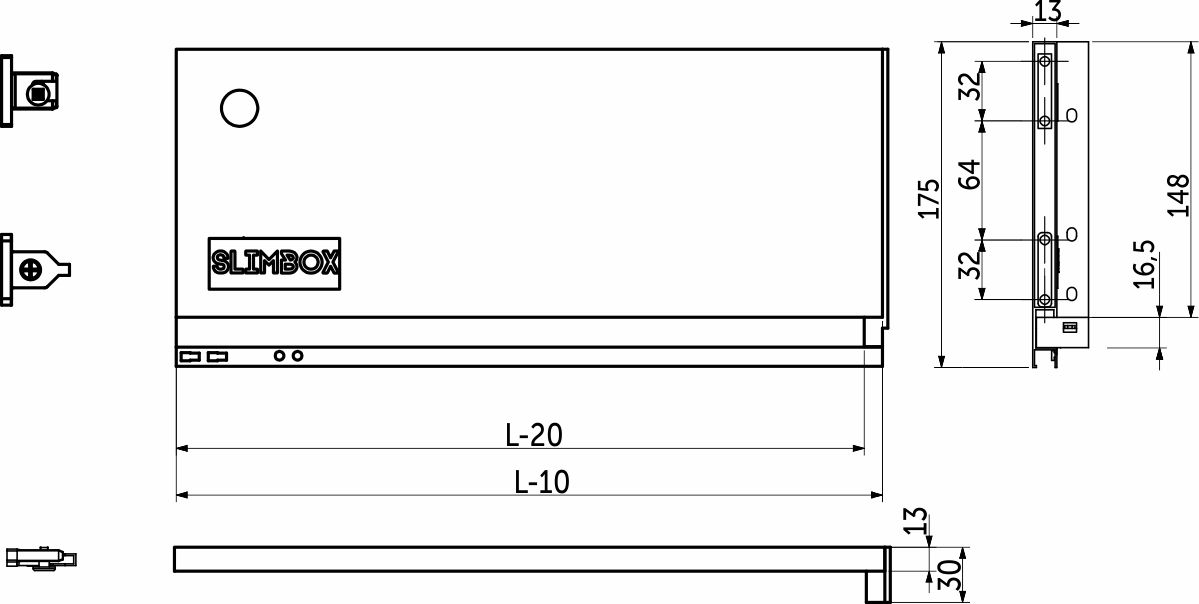 Комплект прямых металлических боковин для выдвижного ящика Slimbox. Включает в себя 2 боковины, держатели фасада и задней стенки, заглушки с логотипом SLIMBOX и необходимый крепёж.