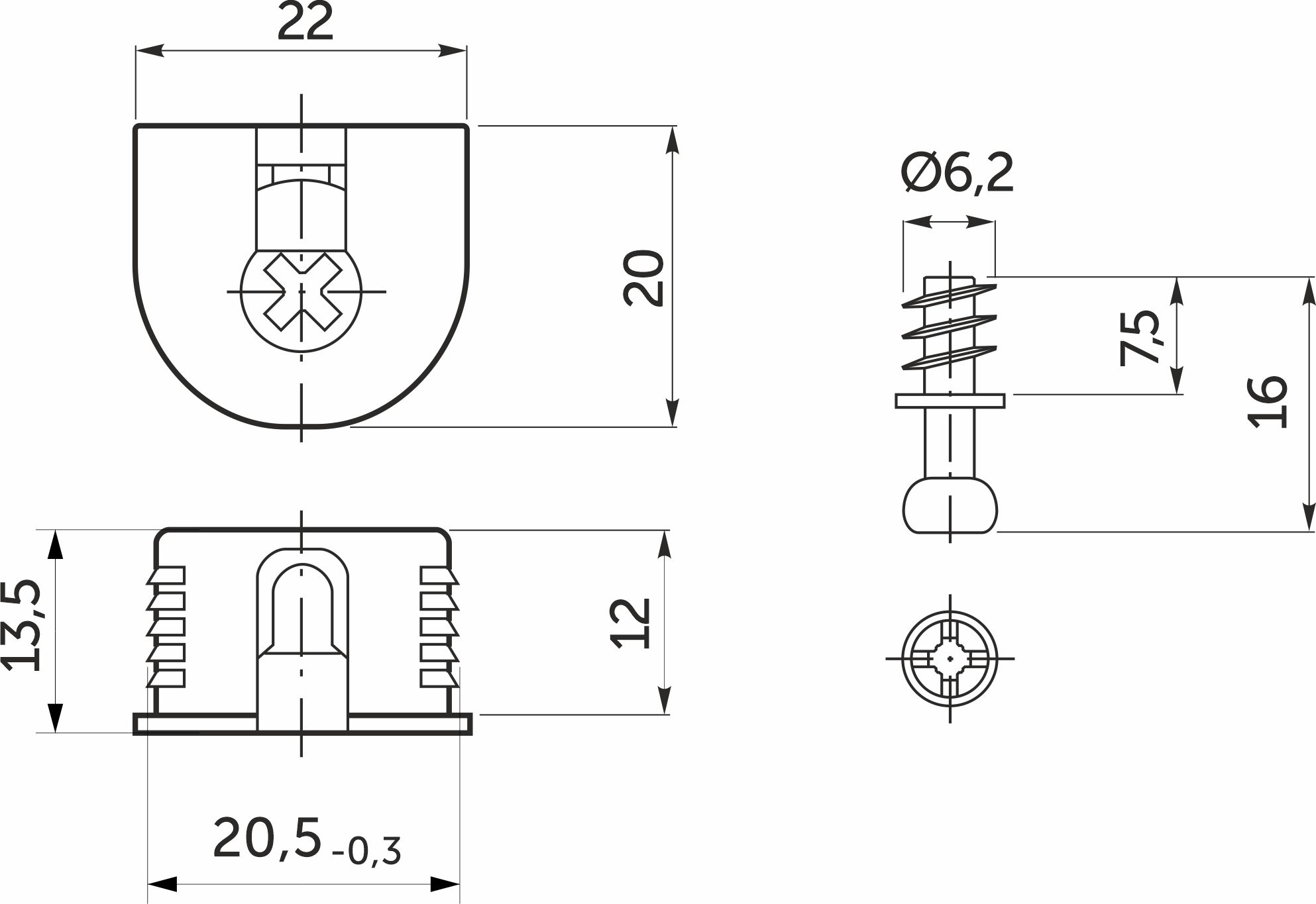 Эксцентриковая стяжка быстрого монтажа 20 мм белая + шток 6*7мм (уп/0,2тыс.шт) GRIDLI