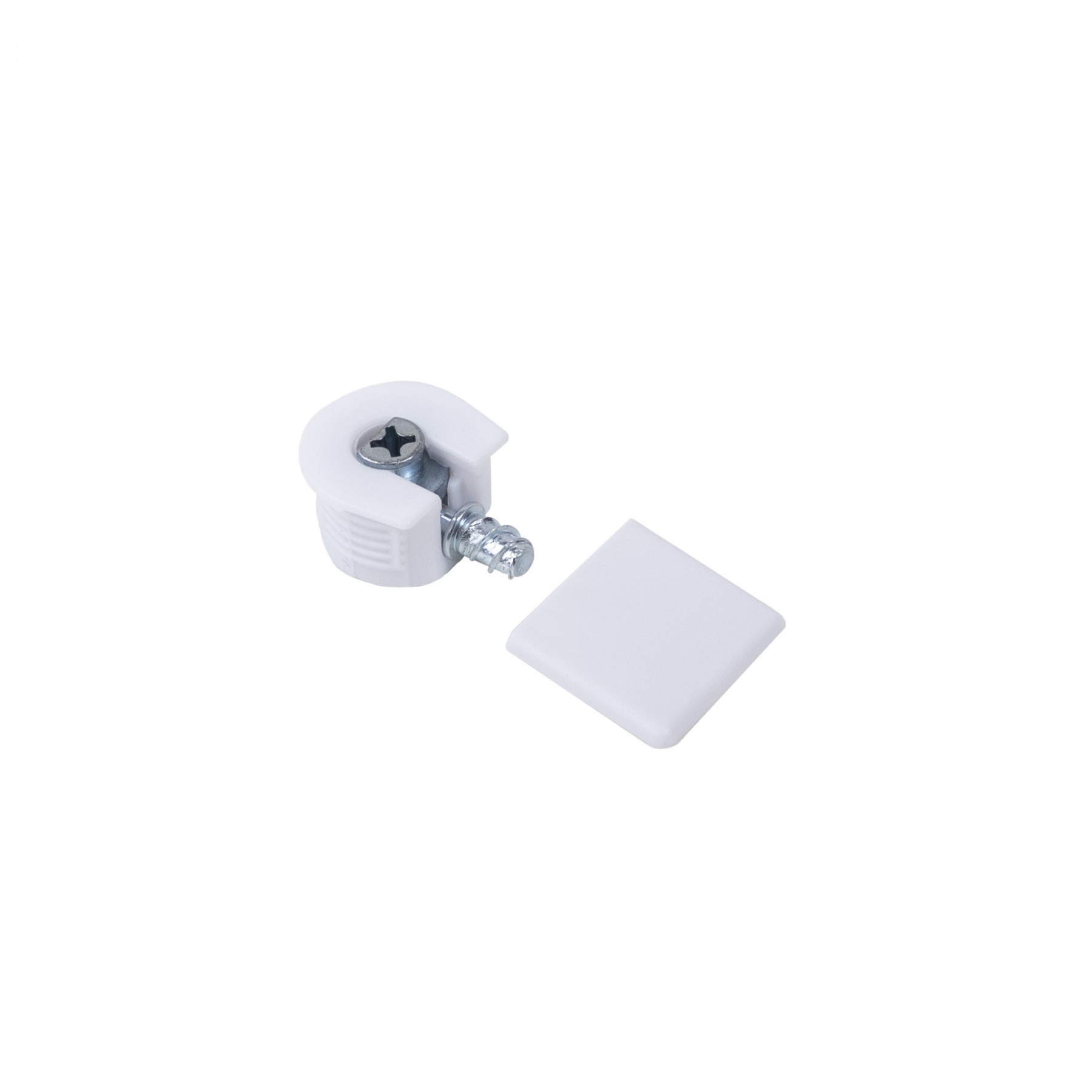 Эксцентриковая стяжка быстрого монтажа (еще ее называют стяжкой для полок, полкодержателем или «рафиксы») в пластиковом корпусе, цвет белый.