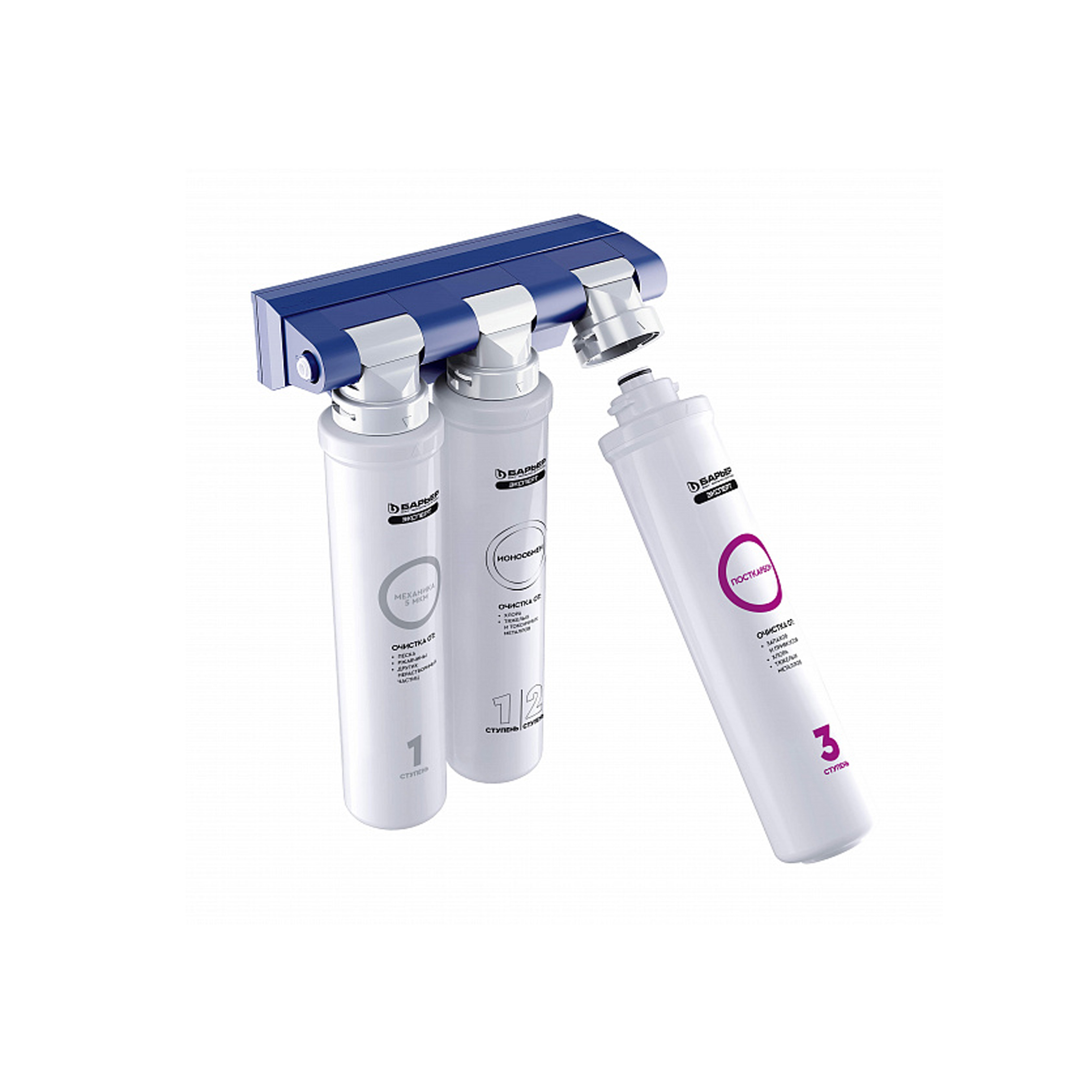 Конструкция фильтра для воды БАРЬЕР позволяет менять картриджи одной рукой без инструментов, специальных ключей и навыков за 30 секунд, а компактные размеры — установить систему очистки воды под мойку даже на небольшой кухне.