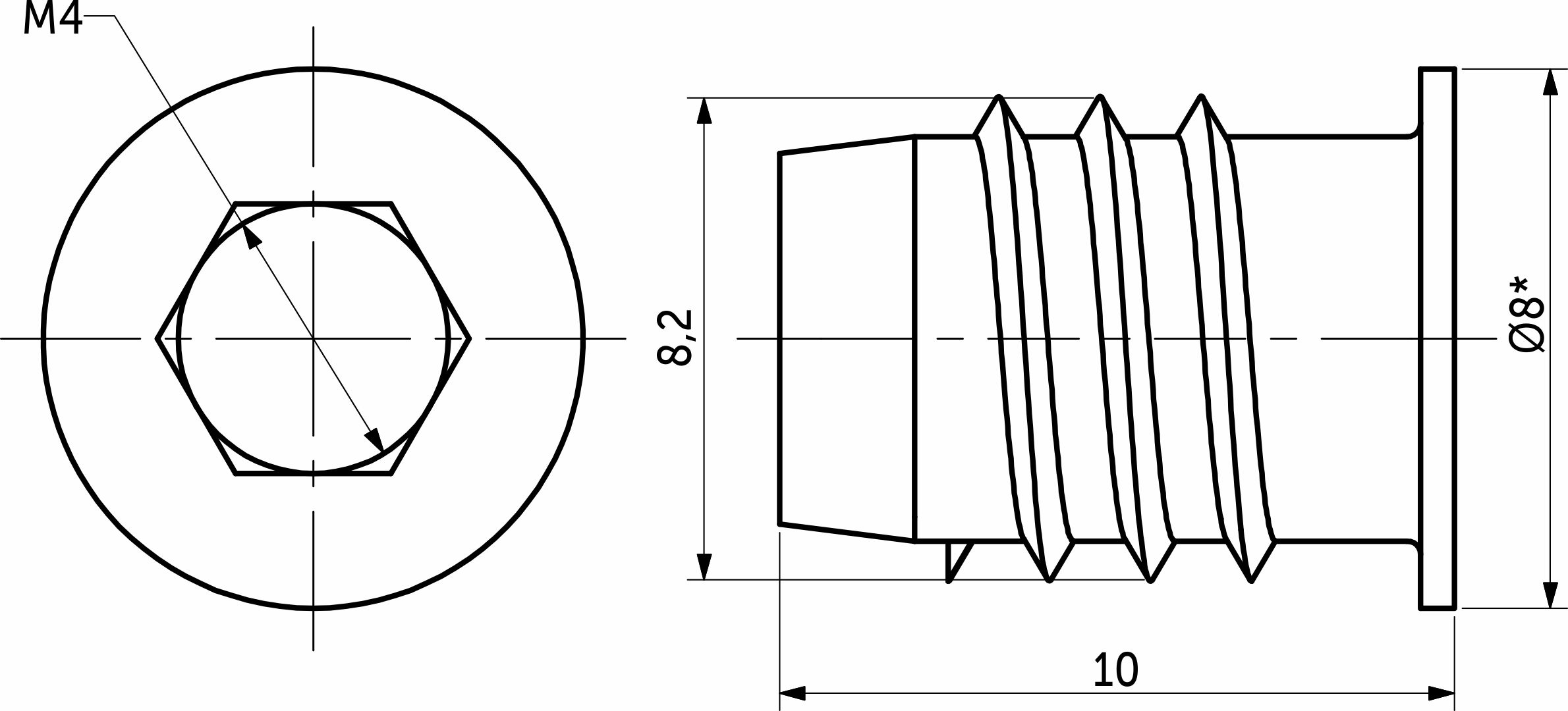 Гайка RAMPA с шестигранным углублением, с буртиком (футорка мебельная), внутренняя резьба - М4, диаметр наружной резьбы – 8,2 мм, общая длина - 10 мм и шлиц под 6-гранный ключ 4мм.