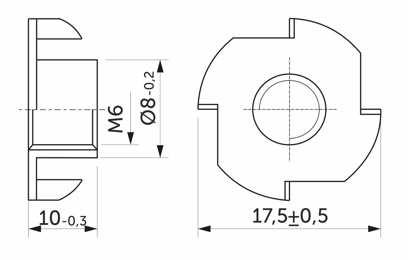 Гайка усовая (носковая, врезная, забивная, крыльчатая, T-nut, DIN 1624) предназначена для соединения деревянных элементов с использованием крепежных деталей с наружной метрической резьбой. «Усики» выполняют роль зацепов в деревянной поверхности и препятствуют проворачиванию гайки. Для установки усовой гайки, необходимо просверлить отверстие соответствующего диаметра и при помощи обычного молотка или специального станка установить гайку. Ответной частью в таком соединении может быть любой винт с соответствующей метрической резьбой. Самыми популярными в мебельном производстве являются усовые гайки с внутренней резьбой М6 и М8 и длиной 9-11 мм.