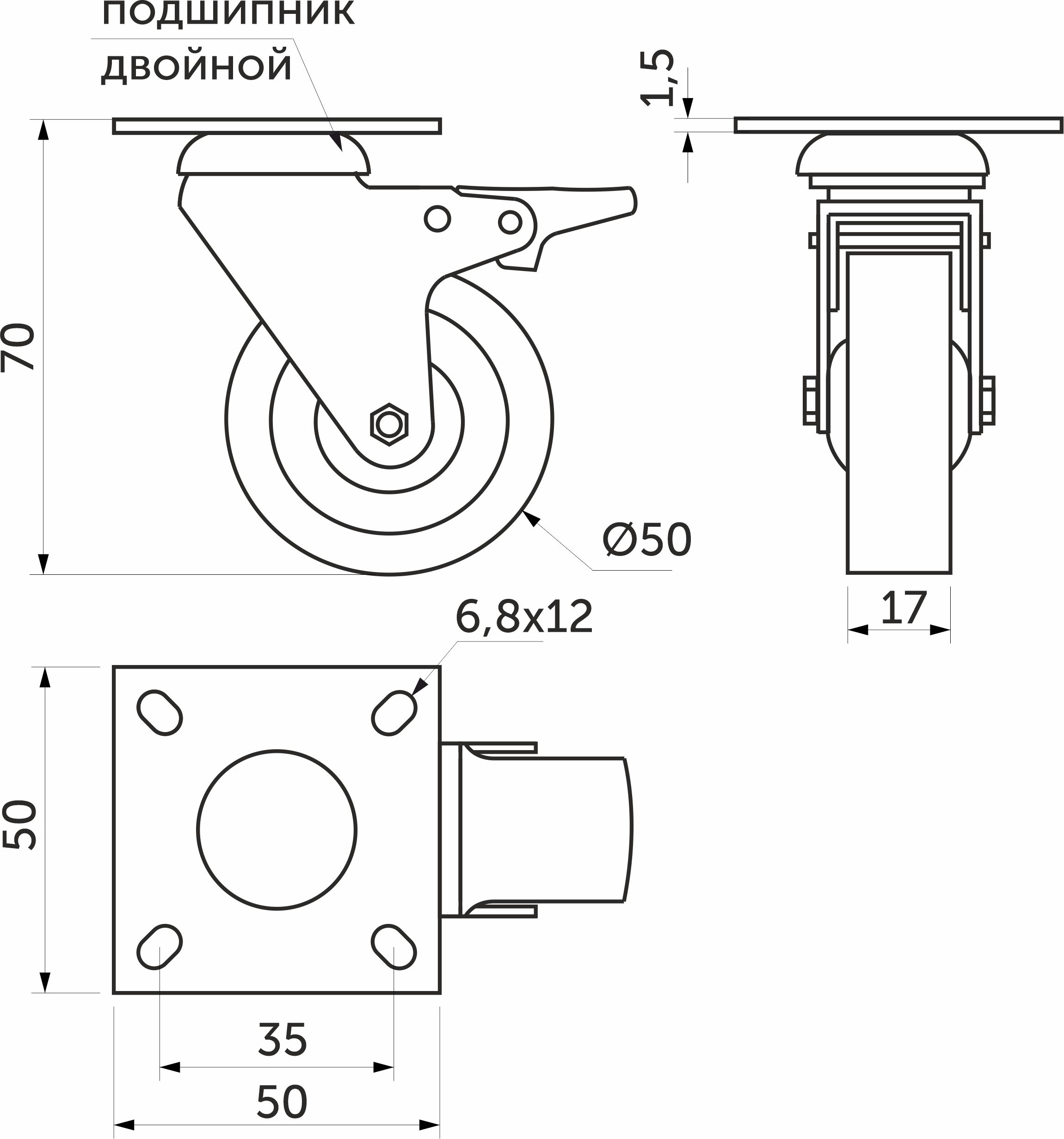 Колесо мебельное, d50 h70 с площадкой с резиновым ободом, с тормозом. Рекомендованная статическая нагрузка до 20 кг