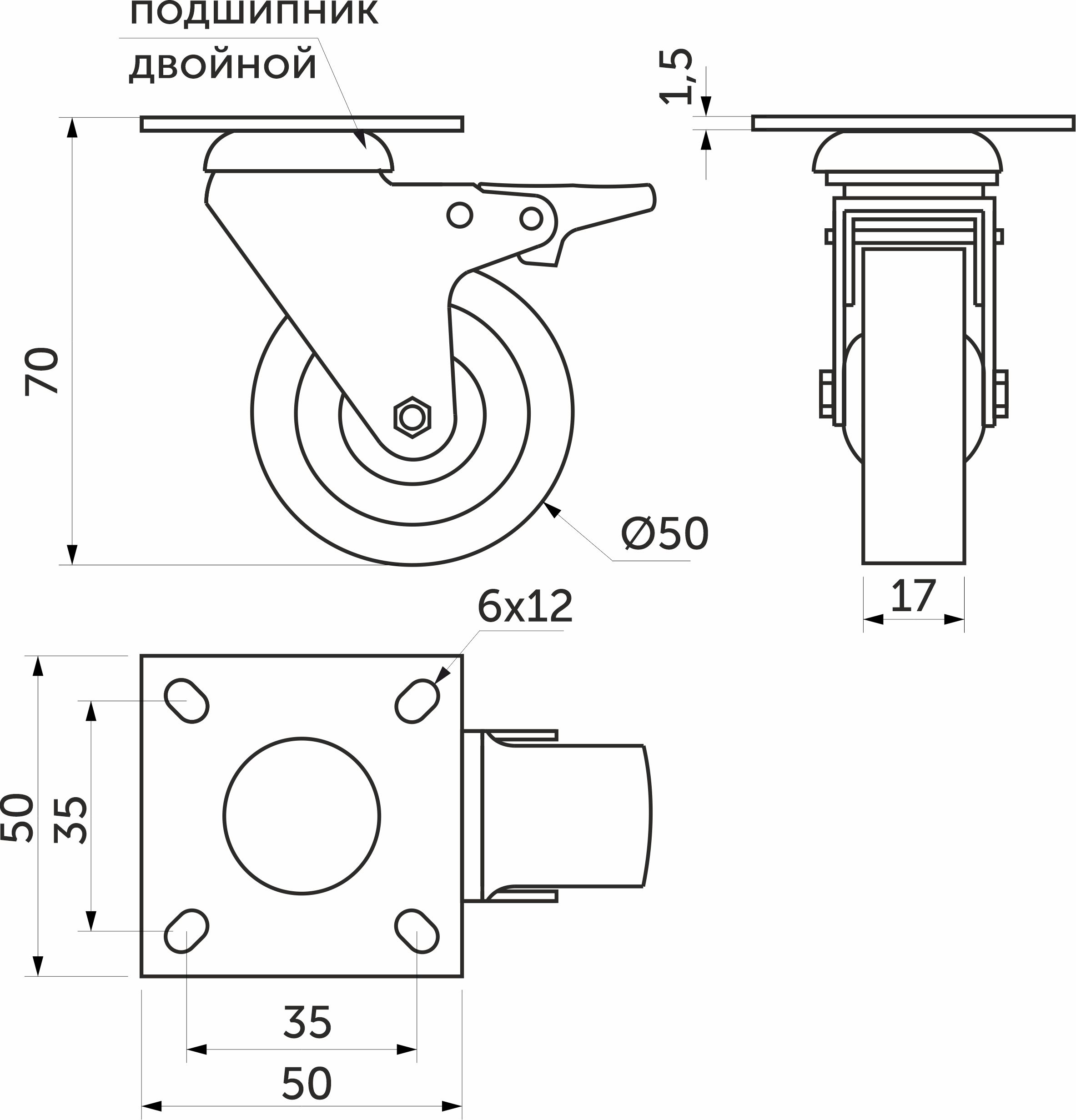 Колесо меб. TECH d50 h70 с площадкой с торм., серый AKS