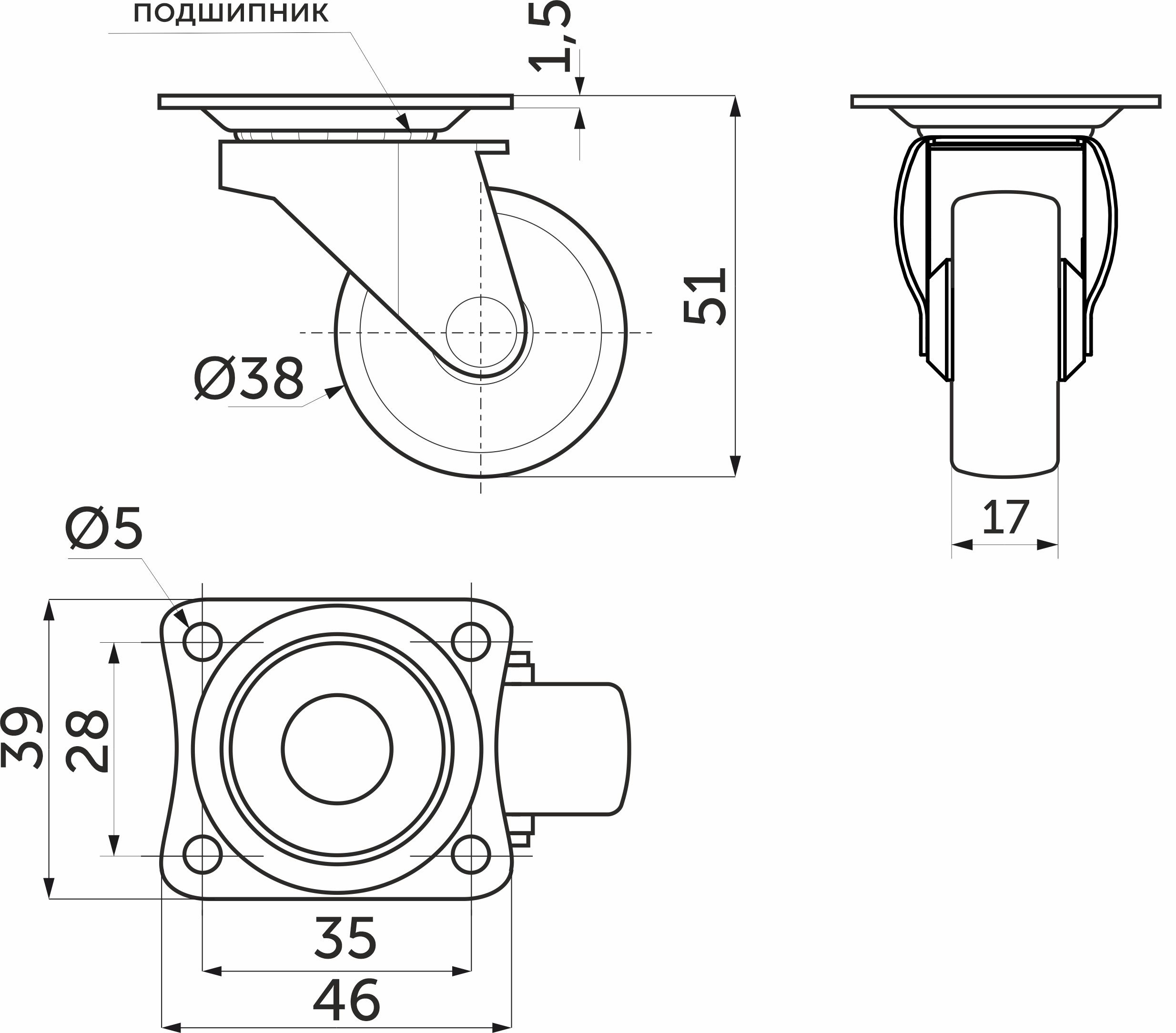 Колесо меб. с рез.ободом d38 h51 с площадкой, черный AKS