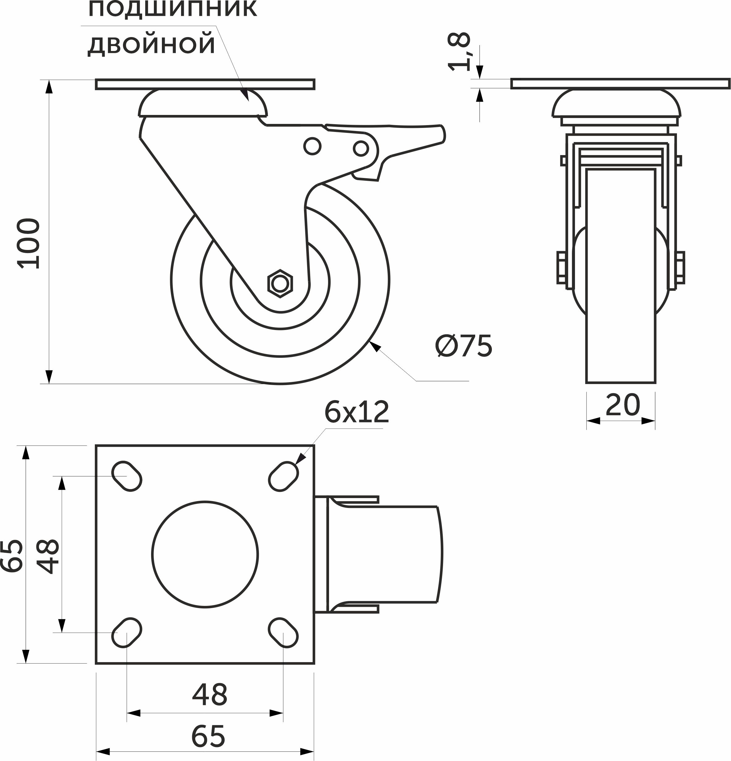 Колесо меб. TECH d75 h100 с площадкой с торм., серый AKS