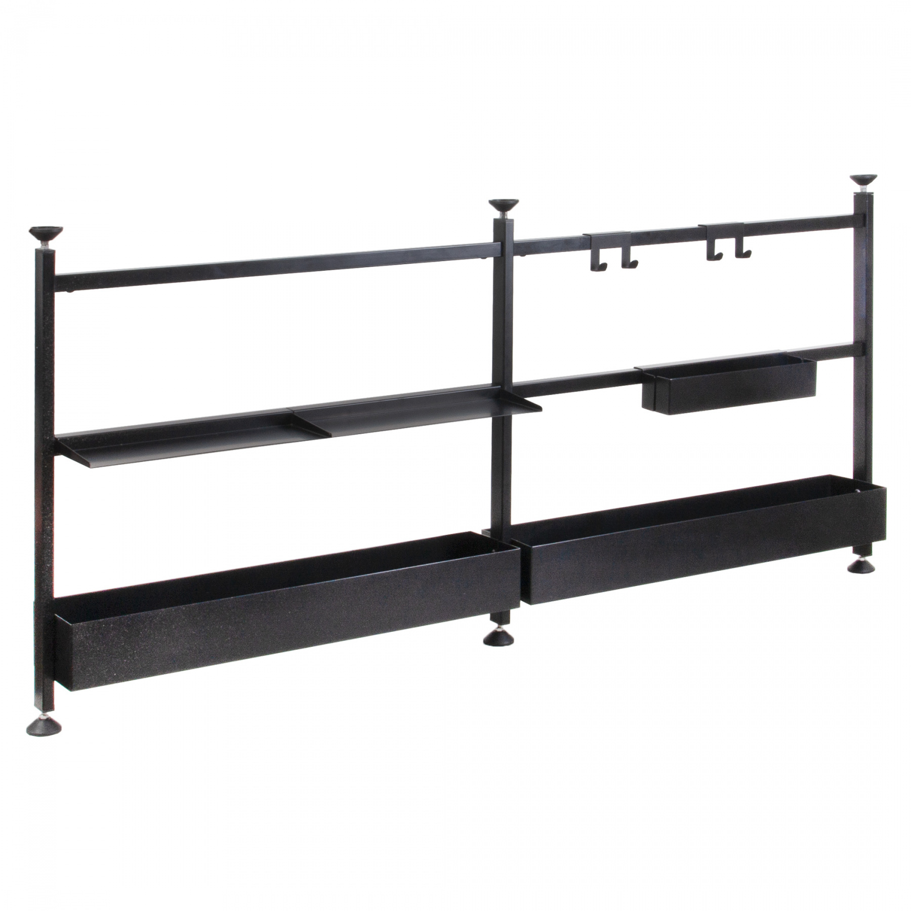 Удобный комплект релинга, оснащенный полками и крючками, не требующий дополнительных инструментов для монтажа и приобретения других сопутствующих товаров. Фиксируется за счет регулировочных ножек (сверху и снизу) между верхним и нижним уровнями ящиков (минимальное расстояние между ящиками - 576 мм, макимальное - 635 мм). В комплектацию входит: 3-уровневая 2-секционная рамка, 4 крючка, 2 открытые полки, 2 больших глубоких полки и 1 мальнькая глубокая полка.