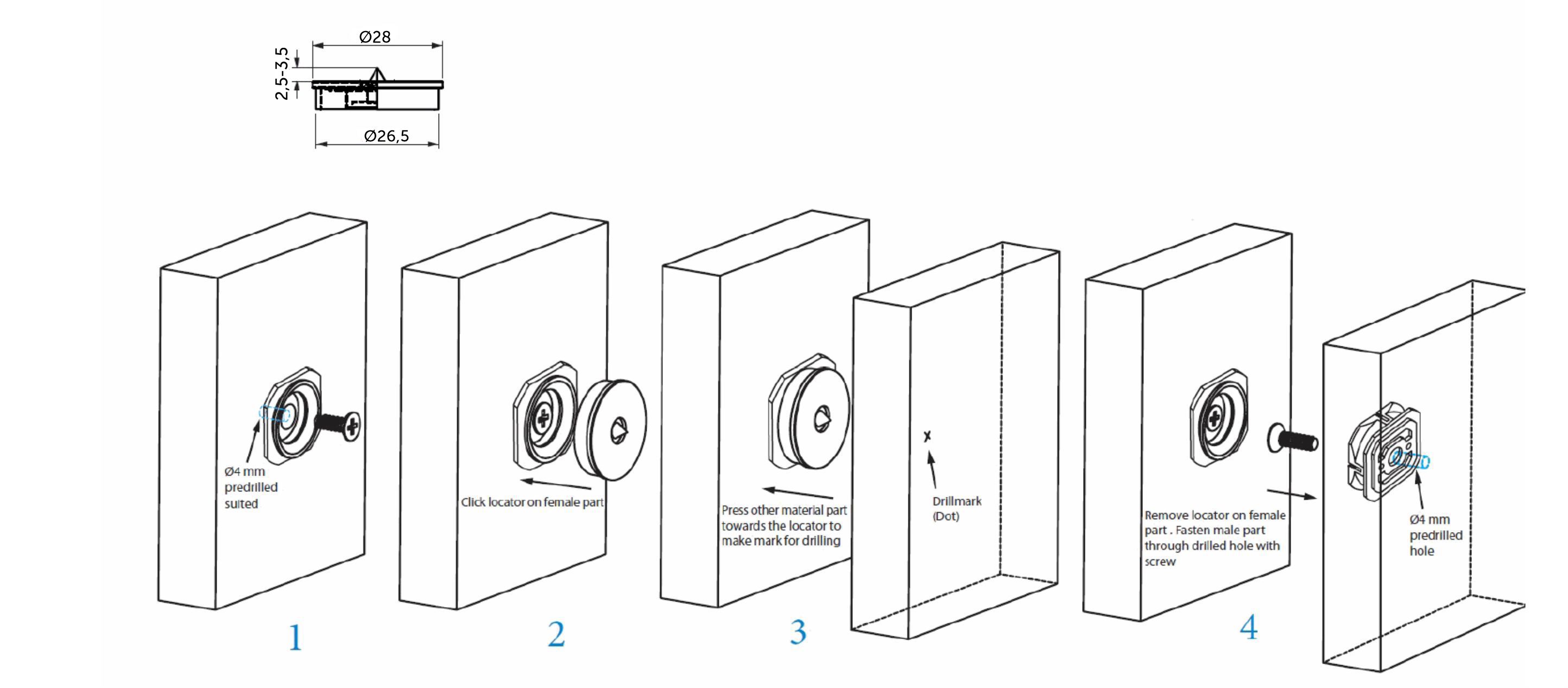 Кнопочный соединитель панелей служит для быстрого и скрытого крепления различных панелей, таких как скинали, к стене. Это соединение состоит из двух элементов: внутренний соединитель («папа») и наружный («мама»), а для более точного и быстрого монтажа рекомендуем использовать специальные съемные многоразовые кондукторы с металлическим шипом. Данные кондукторы при нажатии оставляют отметку для места крепления наружного соединителя на внутренней части устанавливаемой панели. Кнопочные соединители панелей монтируются с помощью саморезов соответствующей длины (по центру крепления находится монтажное отверстие диаметром 5 мм), либо могут фиксироваться к поверхности с помощью клея. Количество таких креплений для каждой панели подбирается индивидуально из расчета максимальной нагрузки 5 кг на одно соединение. Расстояние между стеной и устанавливаемой панелью составляет всего 10 мм.