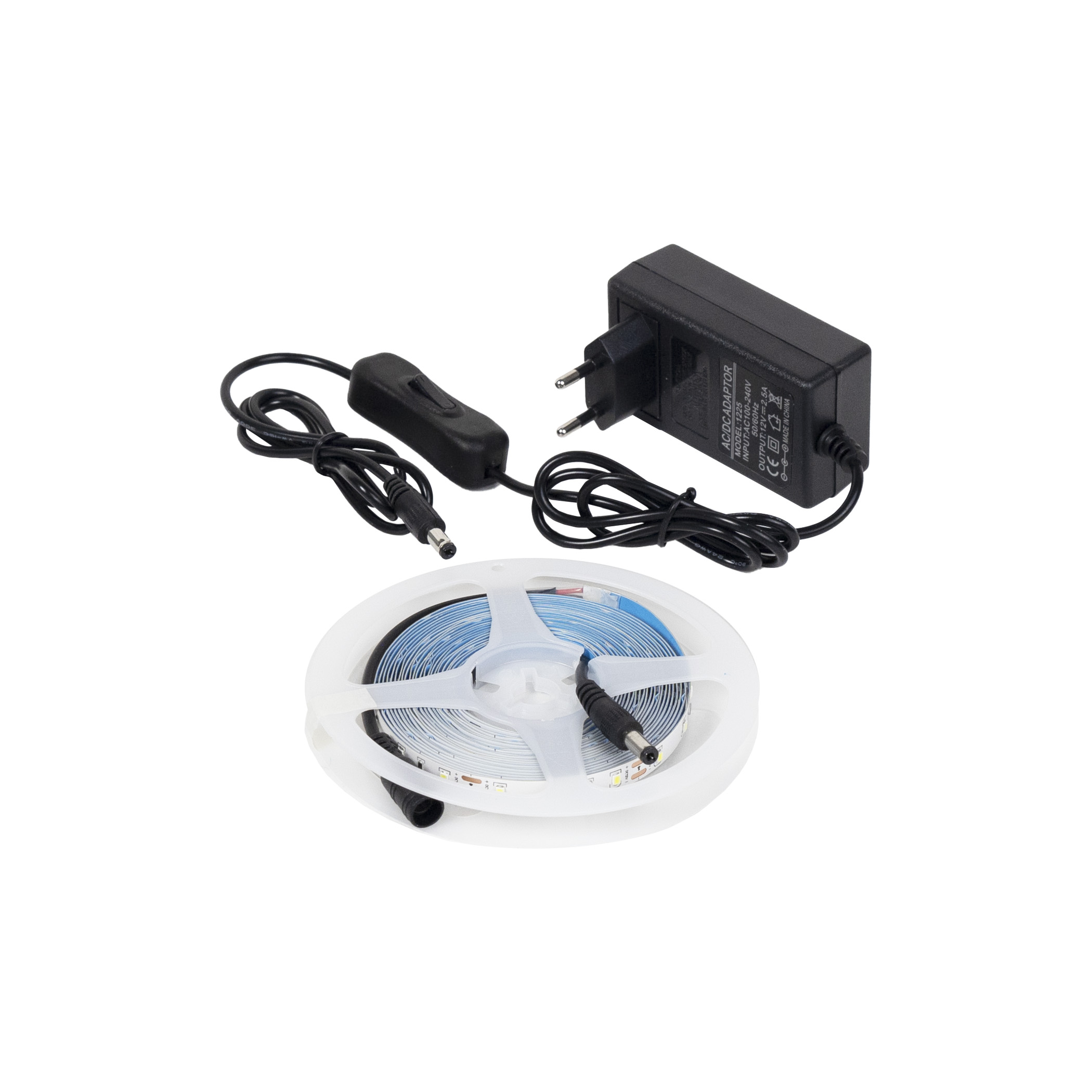 Лента светодиодная - 4,8W/m, 12V, 8мм, 2835, 60 д/м, IP20, теплый белый (3000K) - 5м, + блок питания, AKS