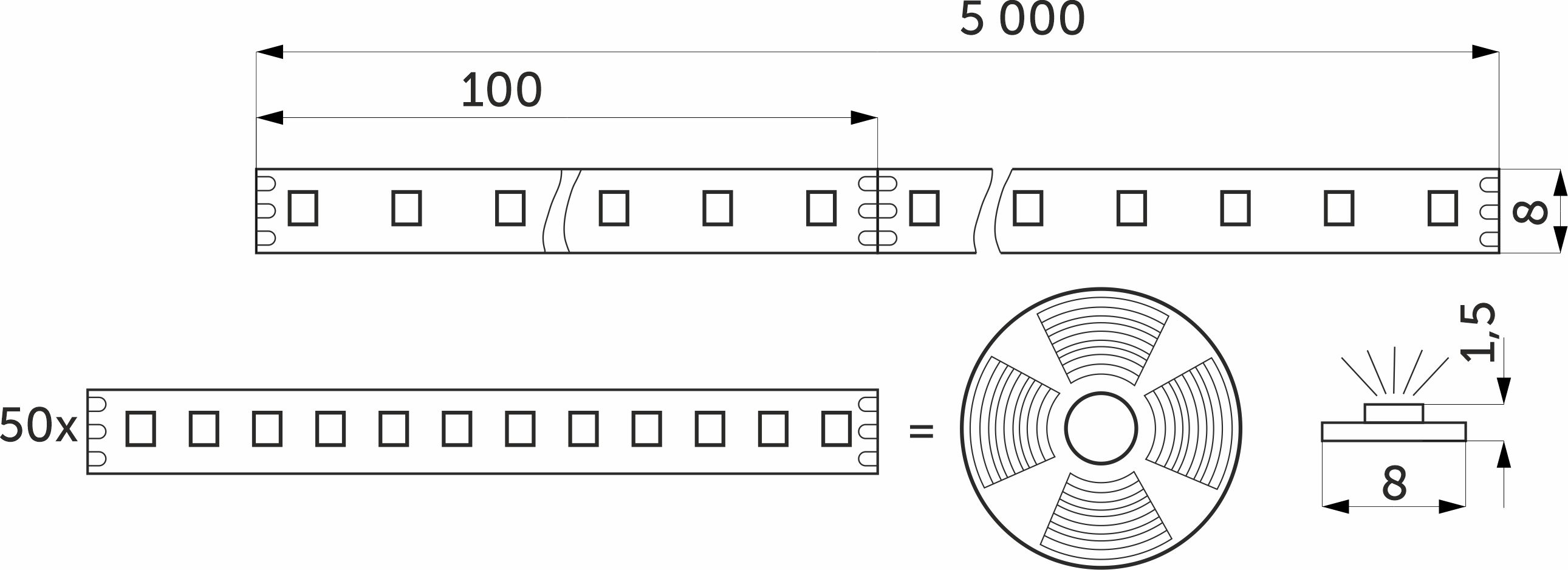 Ширина 8 мм, длина 5 м. Напряжение 12 В