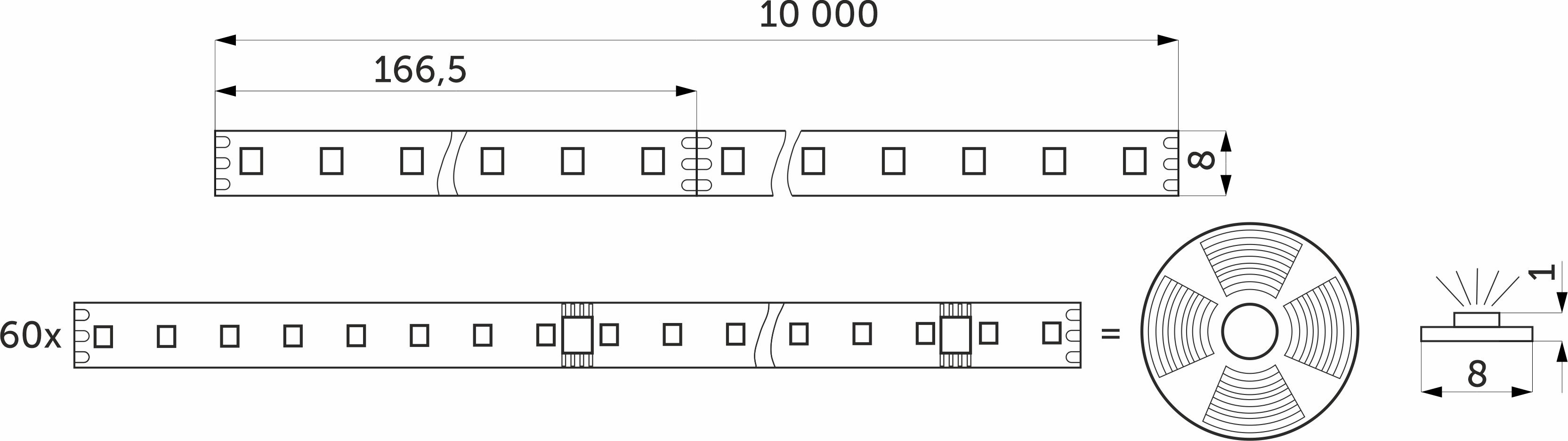 Тип диодов 2835, количество диодов 126 на метр, степень защиты IP20, мощность 12W/m, напряжение 24V, ширина 8 мм, 3000K, длина - 10 м.