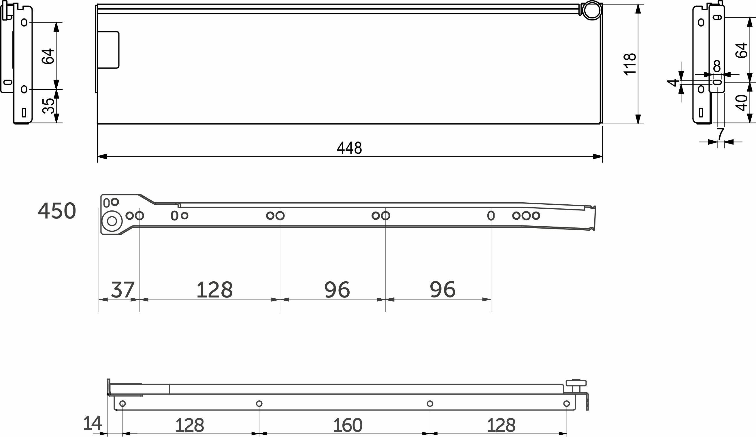 Цельнометаллический выдвижной ящик, построен на базе роликовых направляющих. Имеет две металлические боковины в высотах 54 / 86 / 118 / 150. Имеет неполное выдвижение. Может дополнительно комплектоваться доводчиком. Нагрузка до 25 кг. Используется толщина 1 мм после покраски. Отсутствуют регулировки по плоскостям.