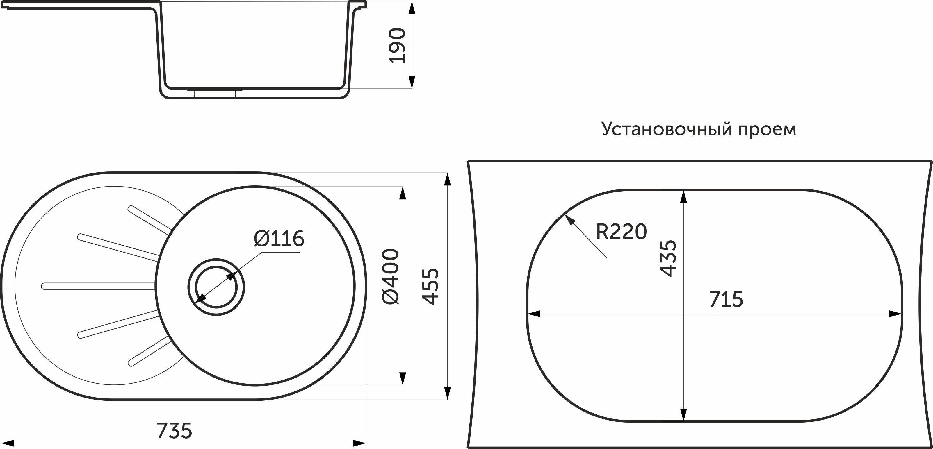 Общий размер (мм): 735 x 455. Размер чаши (мм): 400 x 170. Установочный проём (мм): 715 x 435. Кухонный блок (мм): 800