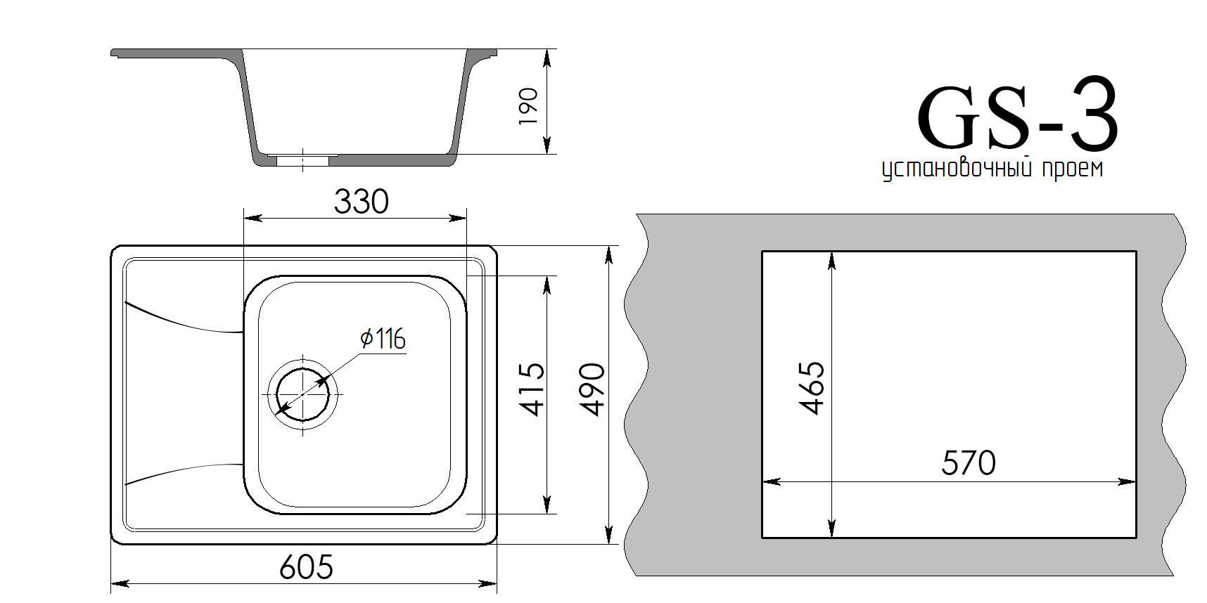 Мойка каменная, прямоугольная одночашевая, GS-3, 605*490 мм, белый, врезная, Gamma Stone