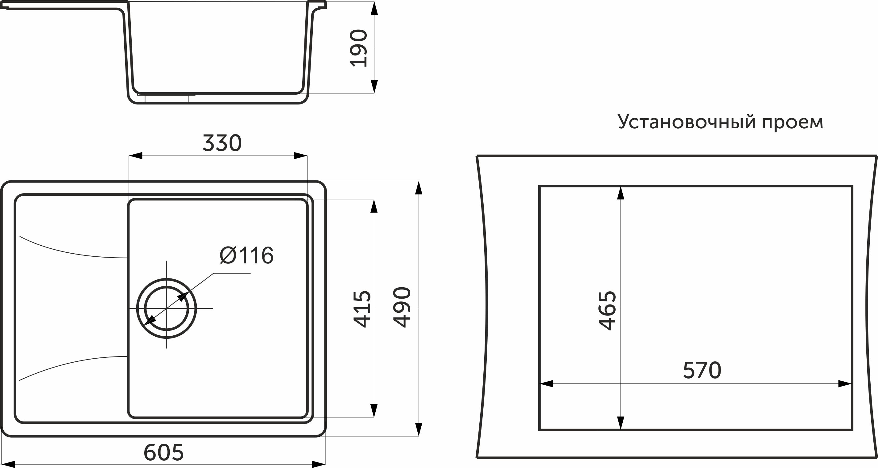Общий размер (мм): 605 x 490. Размер чаши (мм): 415 x 330 x 190. Установочный проём (мм): 570 x 465.
