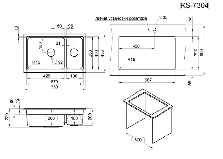 Возможность подстольного монтажа. Подходит для установки в шкаф размером 800 мм. Для удобства использования в чаше имеется площадка для установки ролл-мата или разделочной доски. В комплекте: сифон с отводом для бытовой техники, комплект креплений, дозатор для жидкого мыла (нержавейка) и ролл-мат.