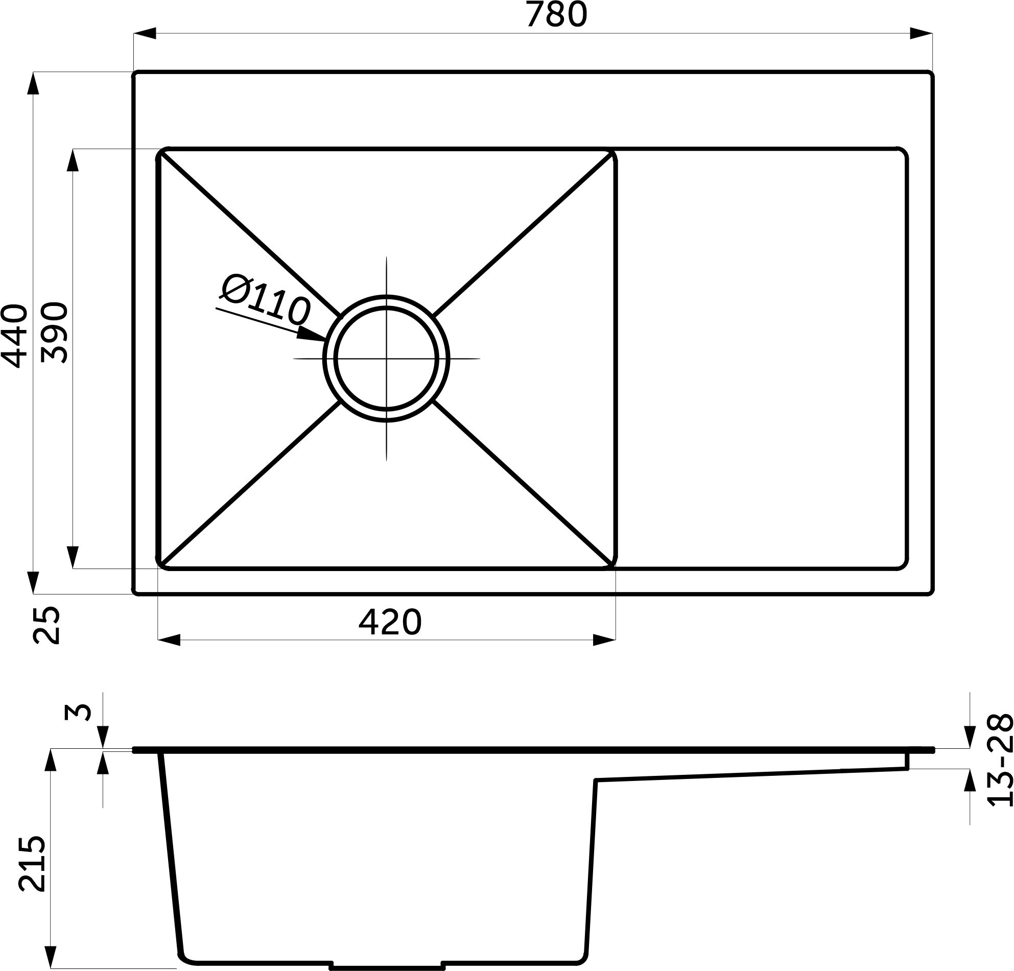 Мойка н/сталь, прямоугольная одночашевая, 780*440мм, мат сатин, PVD, мойка слева, с крылом, универсальная, AKS (3,2мм)