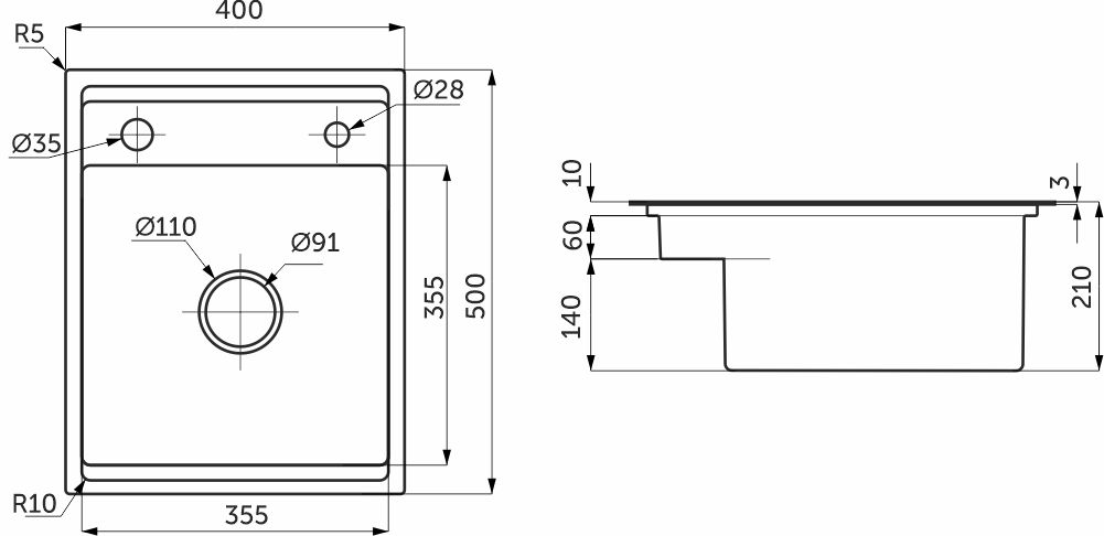 -размер моечной чаши (400 х 500 х 200 мм), толщина стали 3,2 мм придает дополнительную прочность;