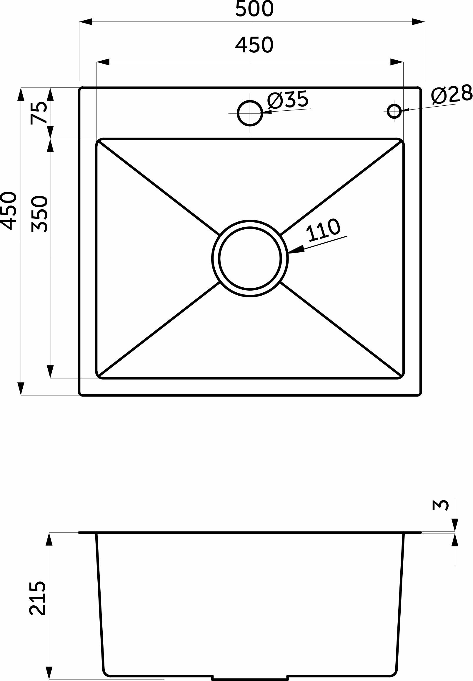 Мойка н/сталь, квадратная одночашевая, 500*500мм, cатин, врезн на/вровень столешнице, AKS (3,2мм)
