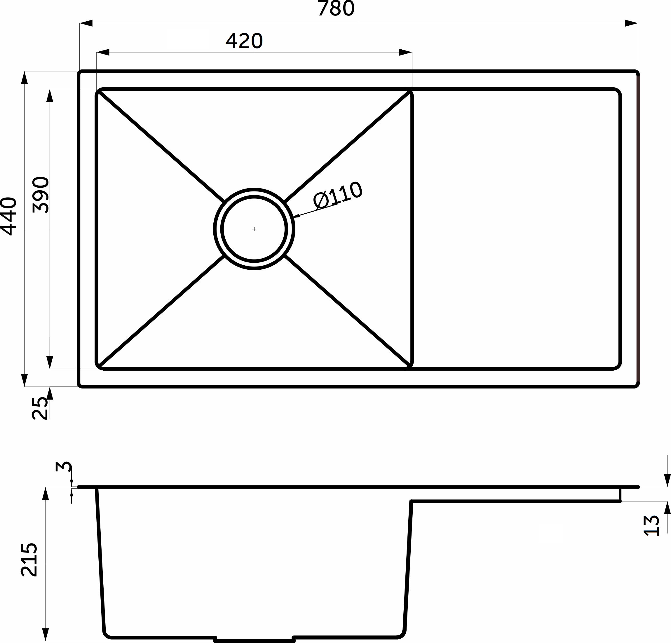 Мойка н/сталь, прямоугольная одночашевая, 780*440мм, сатин, универсальная, AKS (3,2мм)