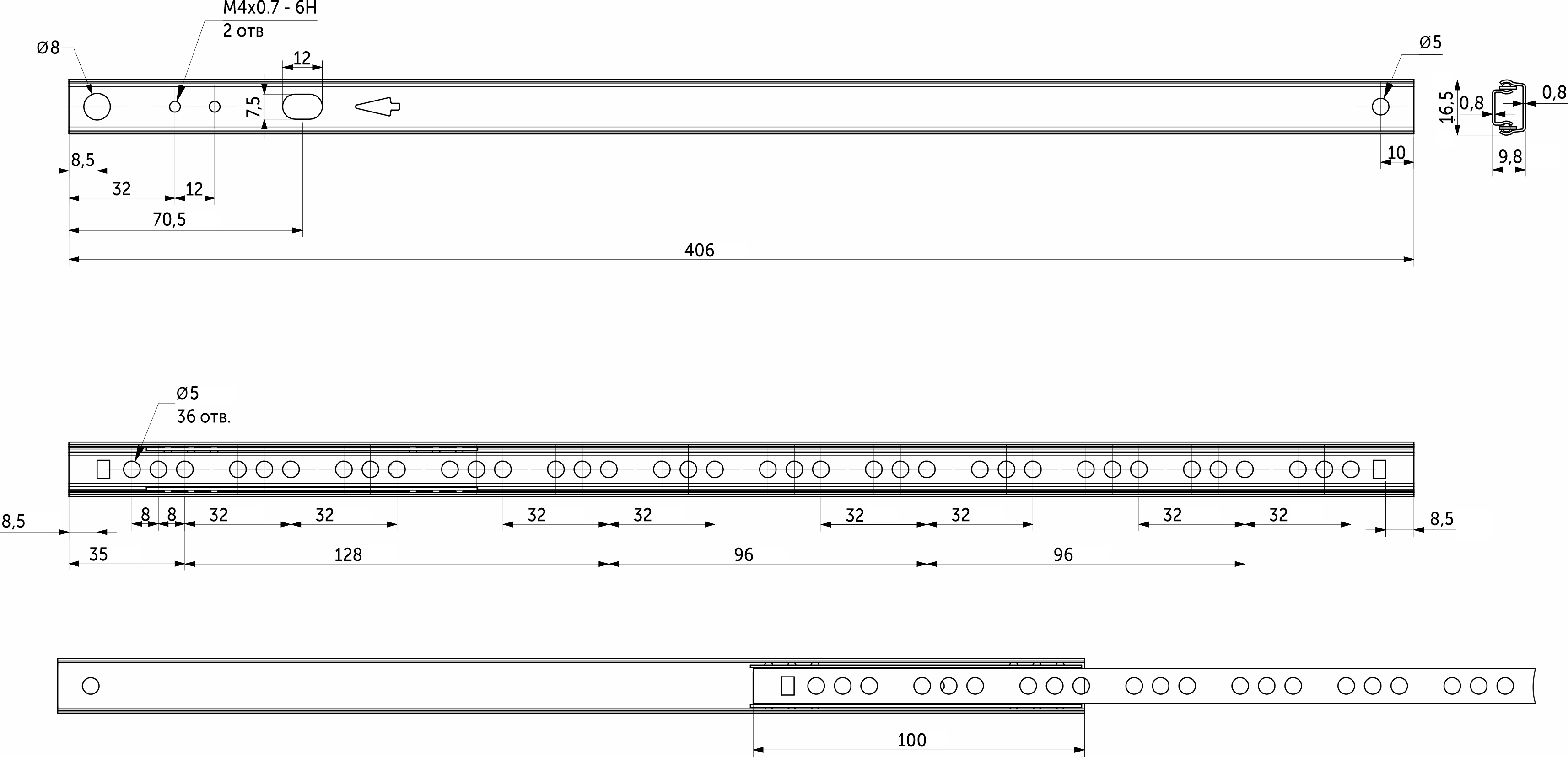 Направляющая с шарикоподшипниковым механизмом (сепаратор пластиковый) и телескопической структурой, обеспечивает неполное выдвижение (3/4). Высота 17 мм. Нагрузка до 10 кг. Изготовлена из холоднокатаной стали. Размерный ряд от 182 до 406 мм. Материал "тележки": нейлон.
