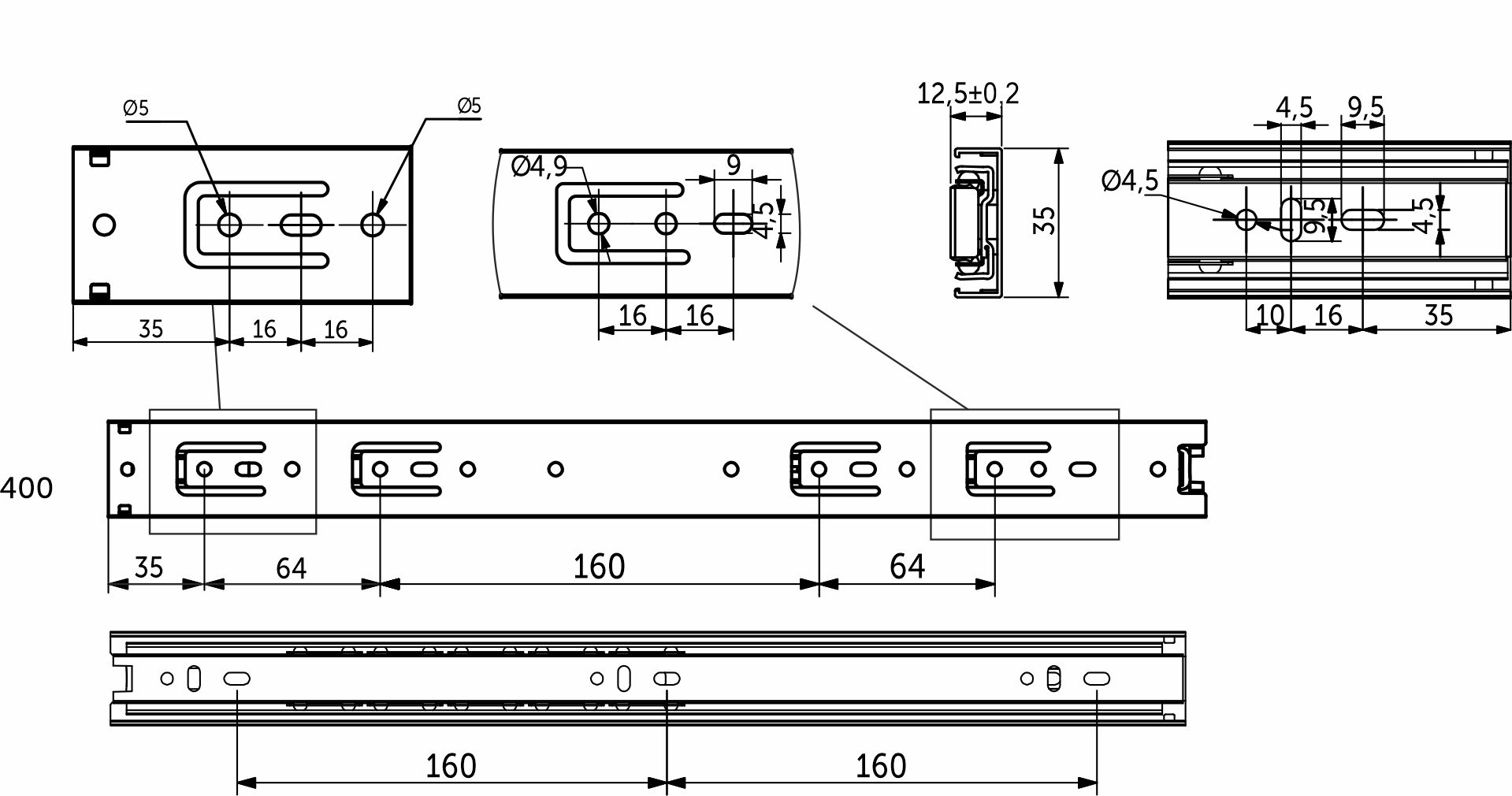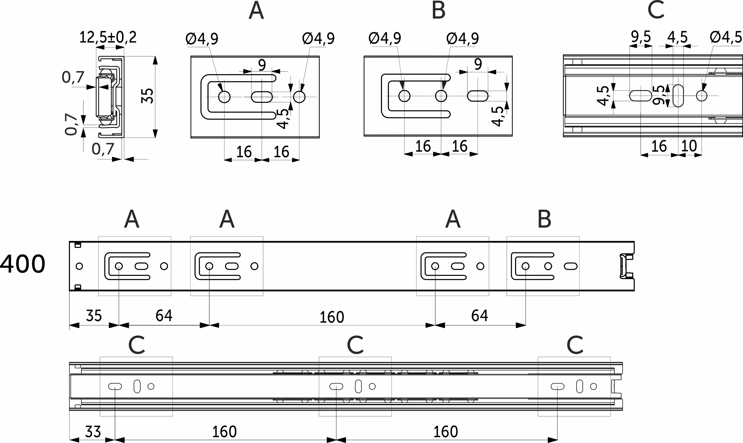 Класcическая направляющая с шарикоподшипниковым механизмом и телескопической структурой, обеспечивает полное выдвижение. Высота 35 мм. Нагрузки от 20 до 25 кг в зависимости от бренда. Направляющая для мебели изготовлена из холоднокатаной стали. Размерный ряд от 250 до 500 мм. Резиновый фиксатор от самопроизвольного открытия.