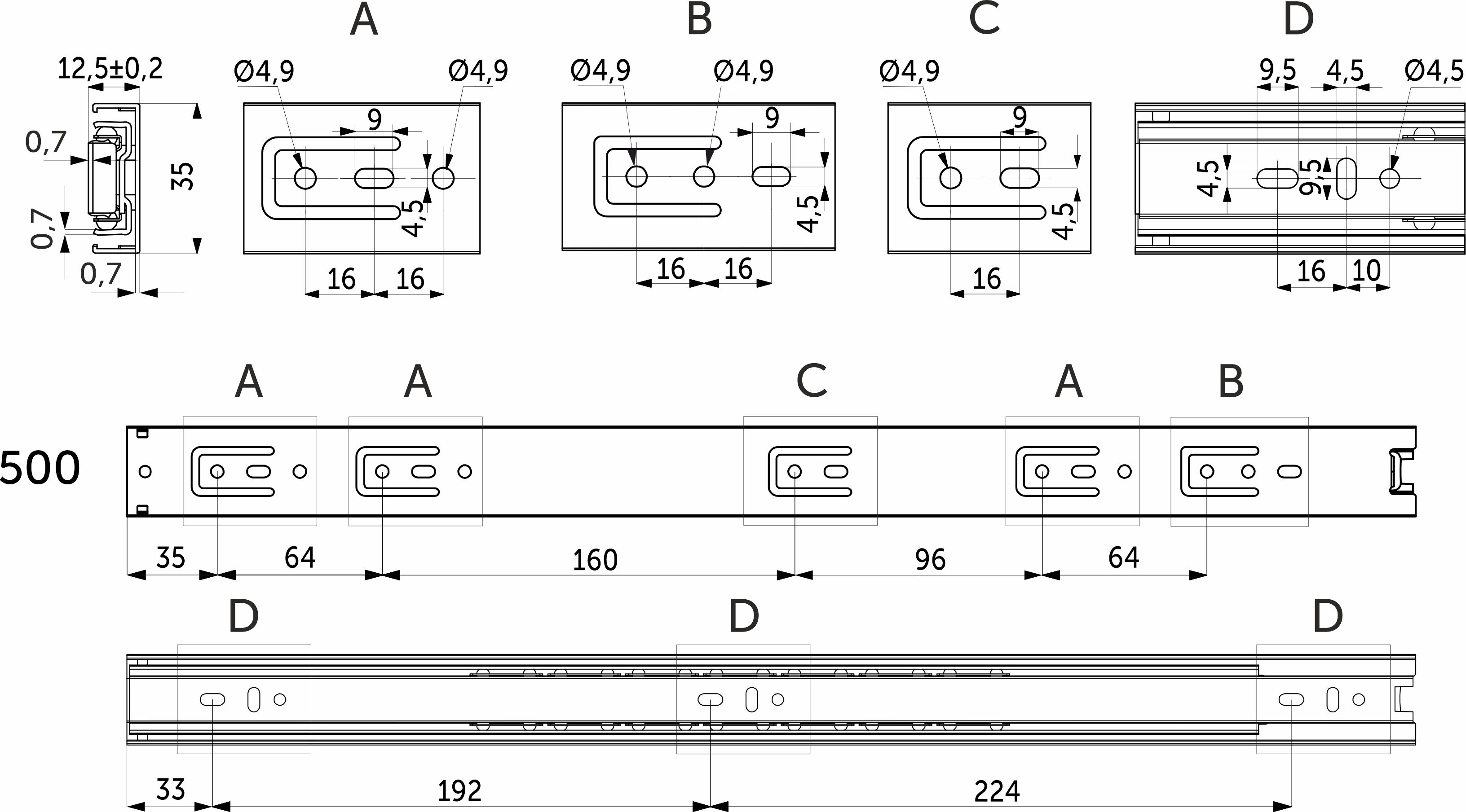 Класcическая направляющая с шарикоподшипниковым механизмом и телескопической структурой, обеспечивает полное выдвижение. Высота 35 мм. Нагрузки от 20 до 25 кг в зависимости от бренда. Направляющая для мебели изготовлена из холоднокатаной стали. Размерный ряд от 250 до 500 мм. Резиновый фиксатор от самопроизвольного открытия.
