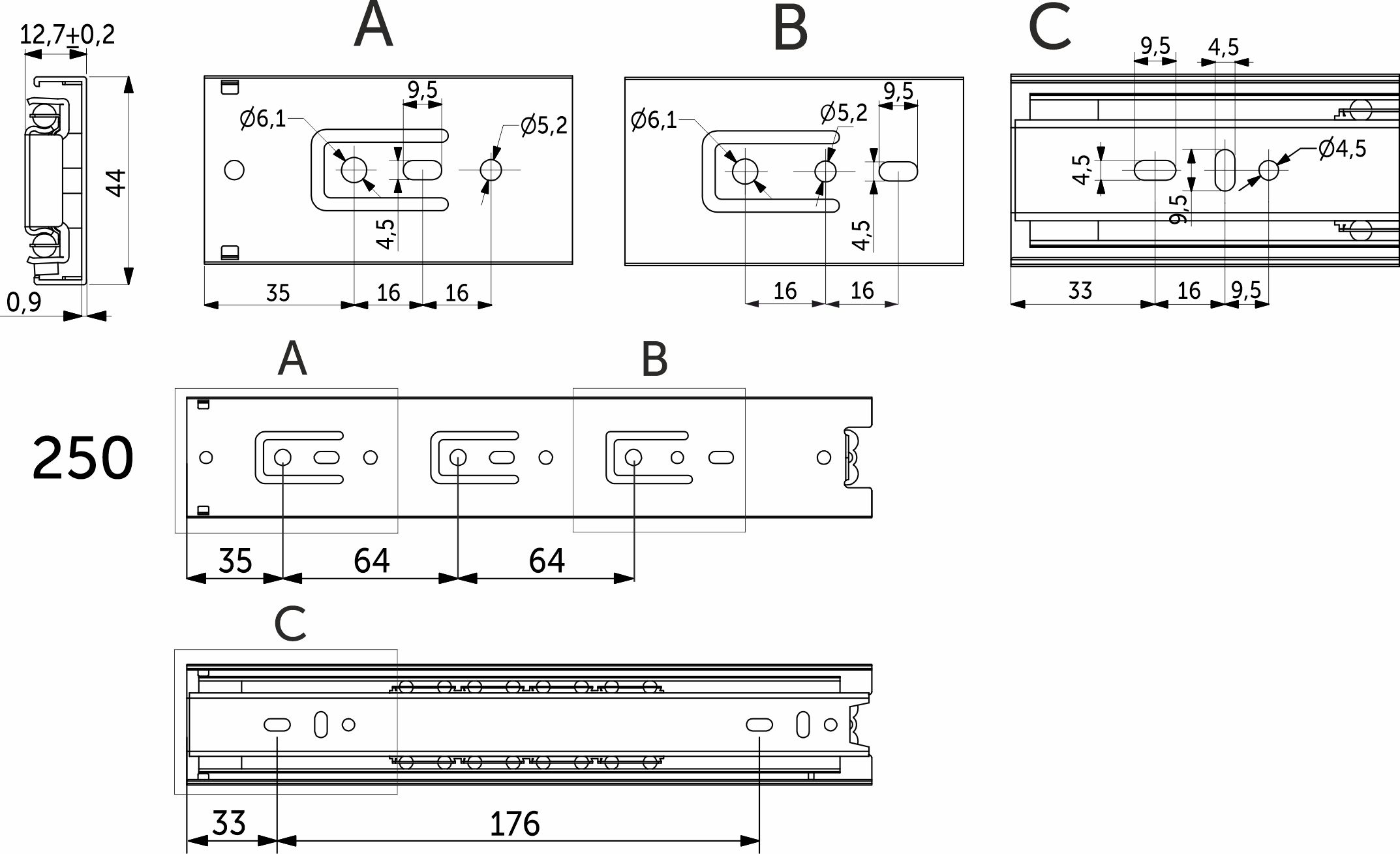 Классическая направляющая с шарикоподшипниковым механизмом и телескопической структурой, обеспечивает полное выдвижение. Высота 45 мм ( бренд AKS LIGHT в 42 мм высоте). Нагрузки от 20 до 35 кг в зависимости от бренда. Изготовлена из холоднокатаной стали. Доступный размерный ряд от 250 до 750 мм. Резиновый фиксатор от самопроизвольного открытия.