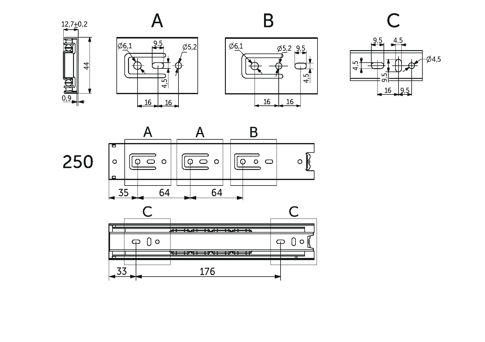Классическая направляющая с шарикоподшипниковым механизмом и телескопической структурой, обеспечивает полное выдвижение. Высота 45 мм ( бренд AKS LIGHT в 42 мм высоте). Нагрузки от 20 до 35 кг в зависимости от бренда. Изготовлена из холоднокатаной стали. Доступный размерный ряд от 250 до 750 мм. Резиновый фиксатор от самопроизвольного открытия.