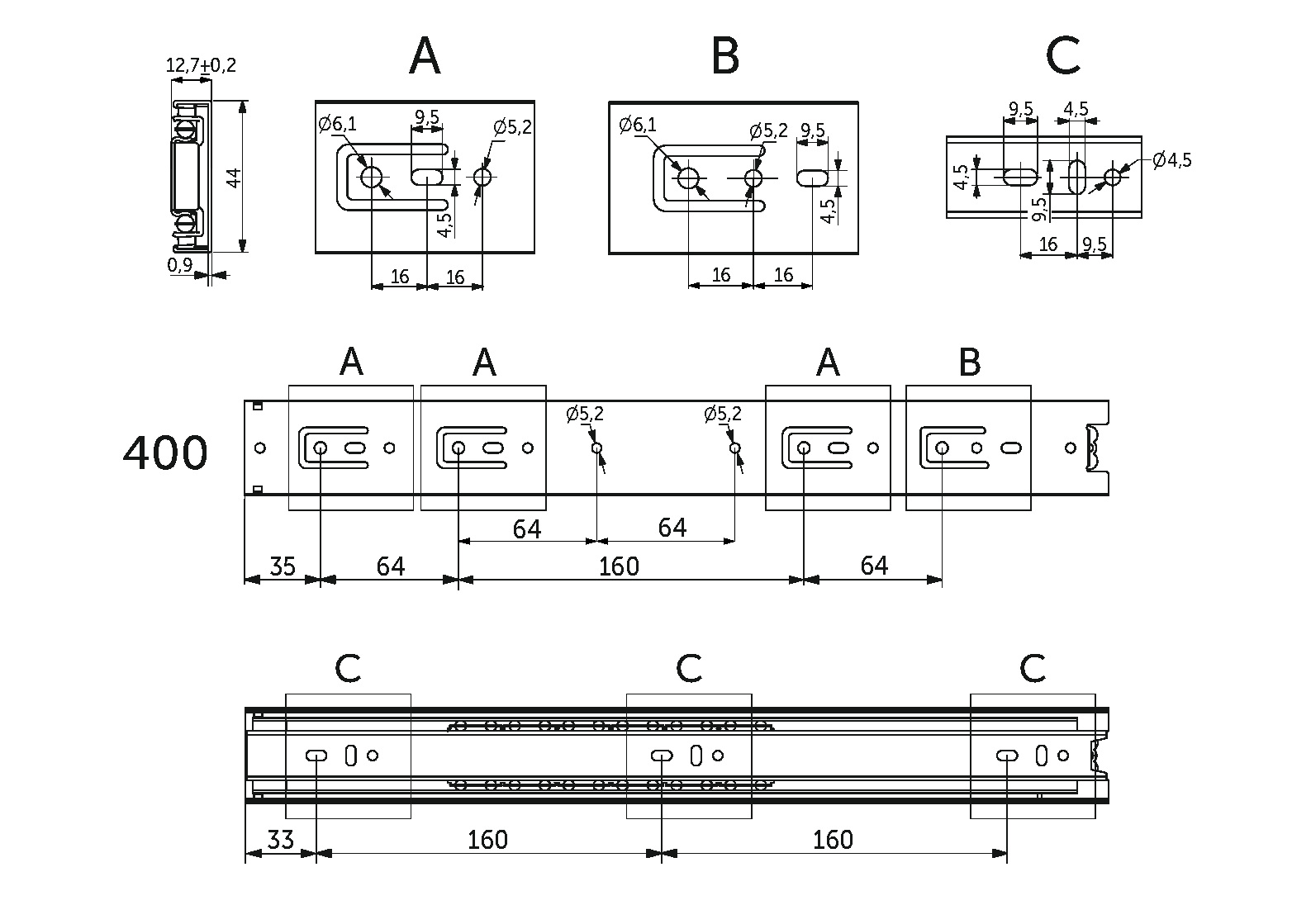 Классическая направляющая с шарикоподшипниковым механизмом и телескопической структурой, обеспечивает полное выдвижение. Высота 45 мм ( бренд AKS LIGHT в 42 мм высоте). Нагрузки от 20 до 35 кг в зависимости от бренда. Изготовлена из холоднокатаной стали. Доступный размерный ряд от 250 до 750 мм. Резиновый фиксатор от самопроизвольного открытия.