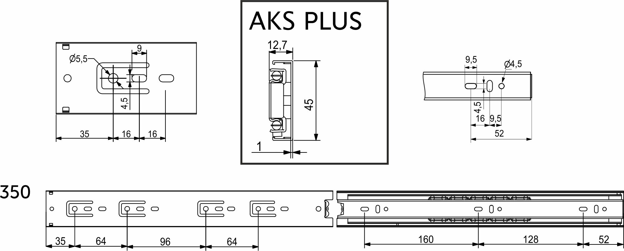 Направляющая шариковая L-350 h=45 AKS PLUS нержавеющая сталь A
