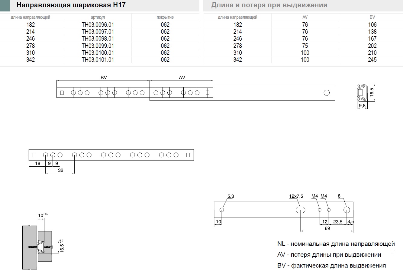 Направляющая шариковая L-182 h=17 REJS