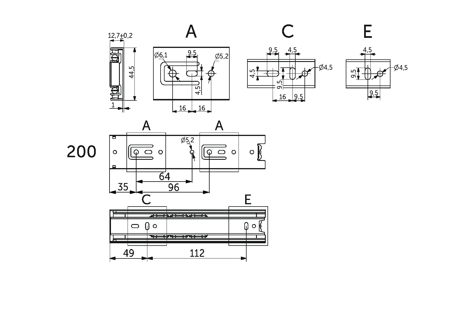 Классическая направляющая с шарикоподшипниковым механизмом и телескопической структурой, обеспечивает полное выдвижение. Высота 45 мм . Изготовлена из холоднокатаной стали. Длина -200 мм. Резиновый фиксатор от самопроизвольного открытия. Нагрузка -35 кг, Толщины 1,0*1,0*1,2 ( запас прочности - 80000 циклов).