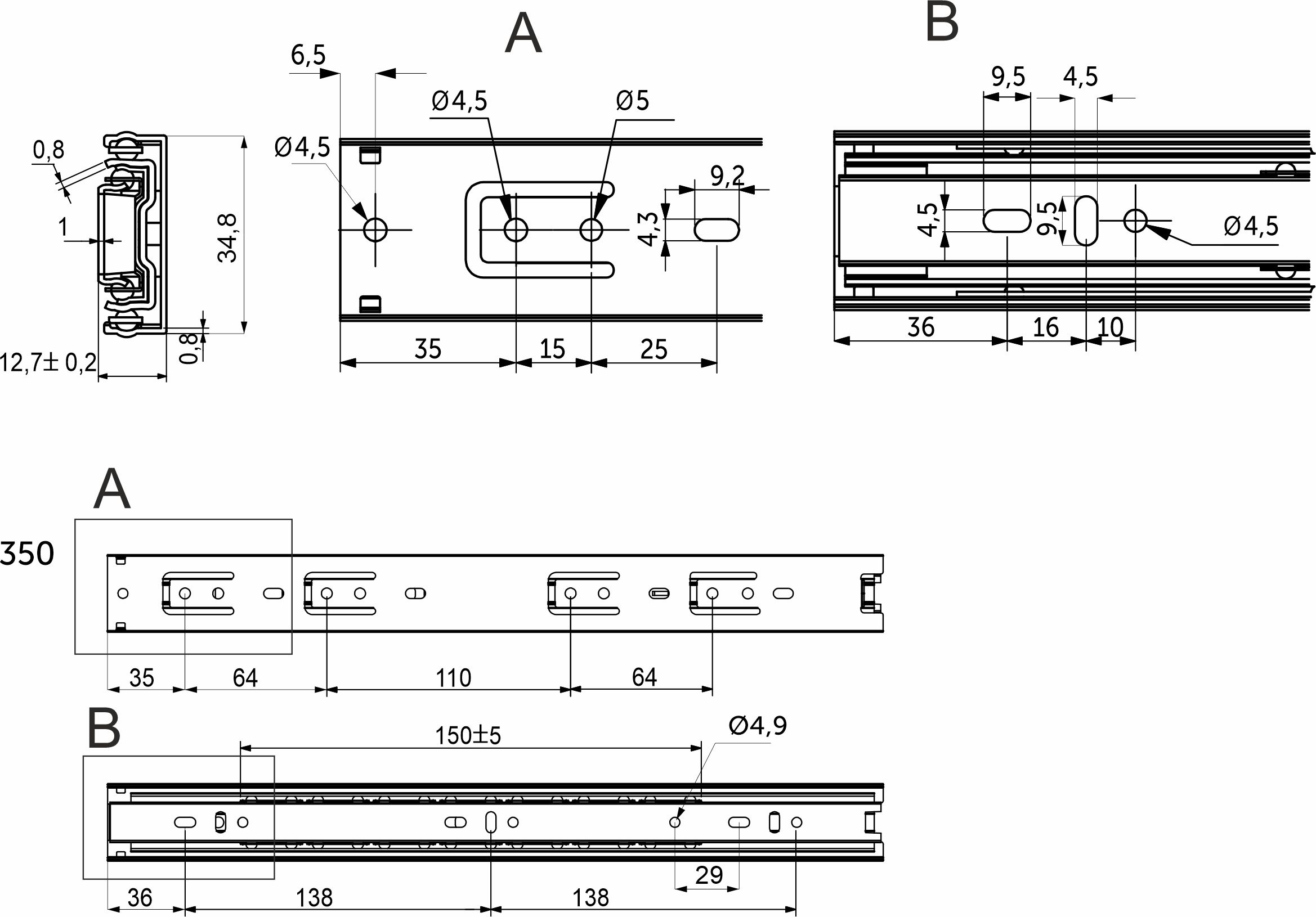 Направляющая для мебели AKS изготовлена из холоднокатаной стали толщиной 0,7*0,7*0,7 мм, имеет резиновый фиксатор от самопроизвольного открытия. Фактическая высота данной направляющей 35 мм, а её длина – 350 мм.