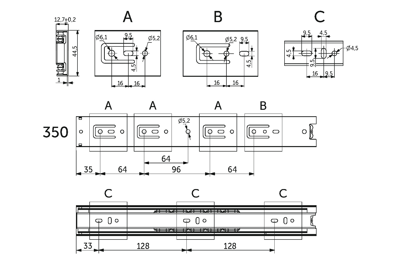Высота 45 мм. Нагрузка 35 кг. Длина - 350 мм.