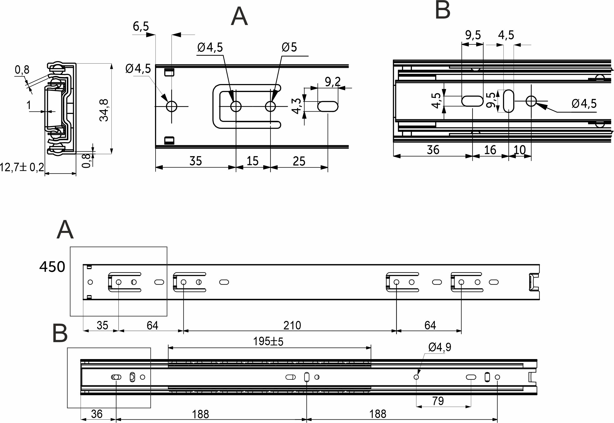 Направляющая для мебели AKS изготовлена из холоднокатаной стали толщиной 0,7*0,7*0,7 мм, имеет резиновый фиксатор от самопроизвольного открытия. Фактическая высота данной направляющей 35 мм, а её длина – 450 мм.