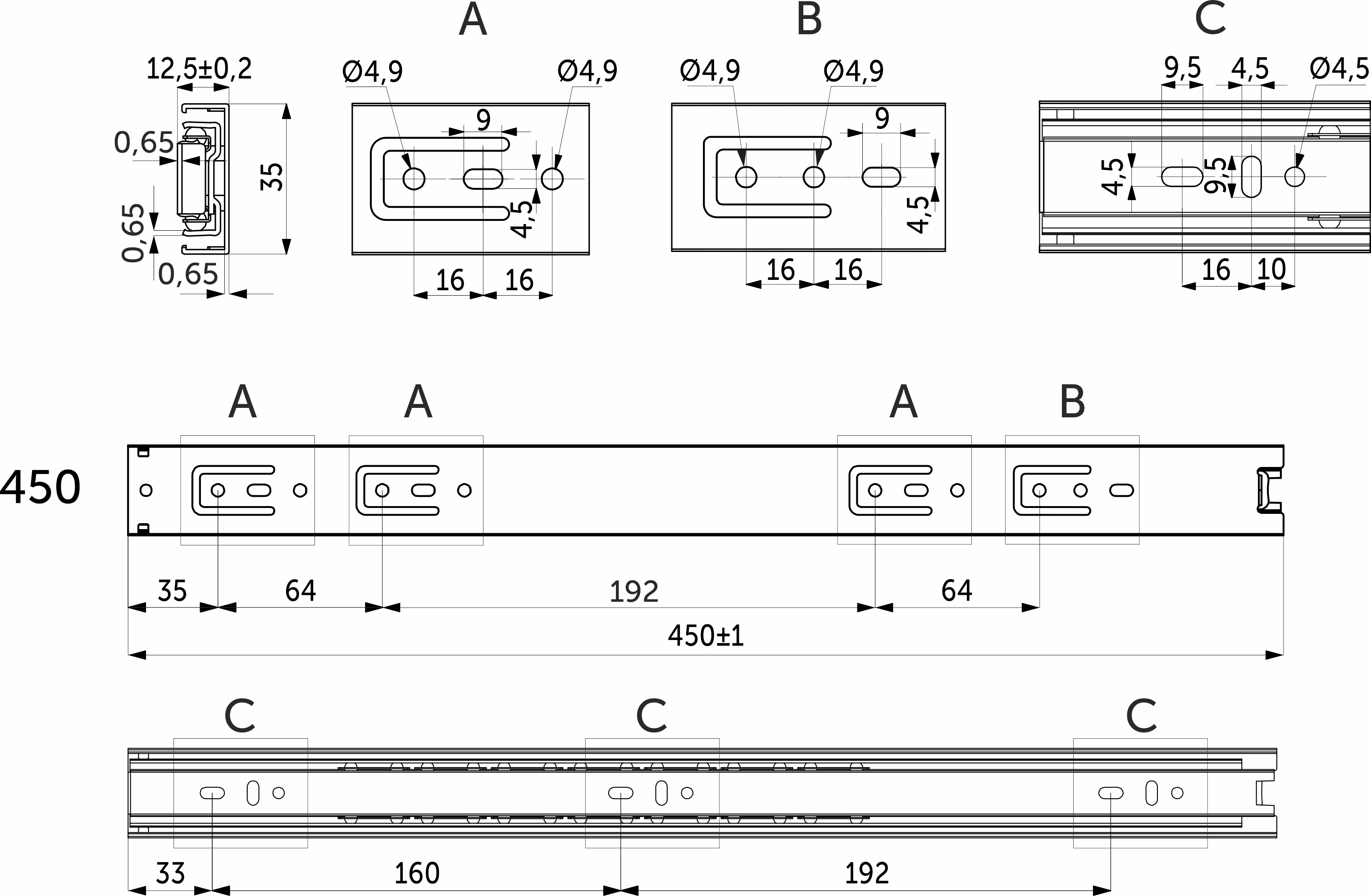 Направляющая для мебели GRIDLI изготовлена из холоднокатаной стали толщиной 0,65*0,65*0,65 мм, имеет резиновый фиксатор от самопроизвольного открытия. Фактическая высота данной направляющей 35 мм, а её длина – 450 мм.