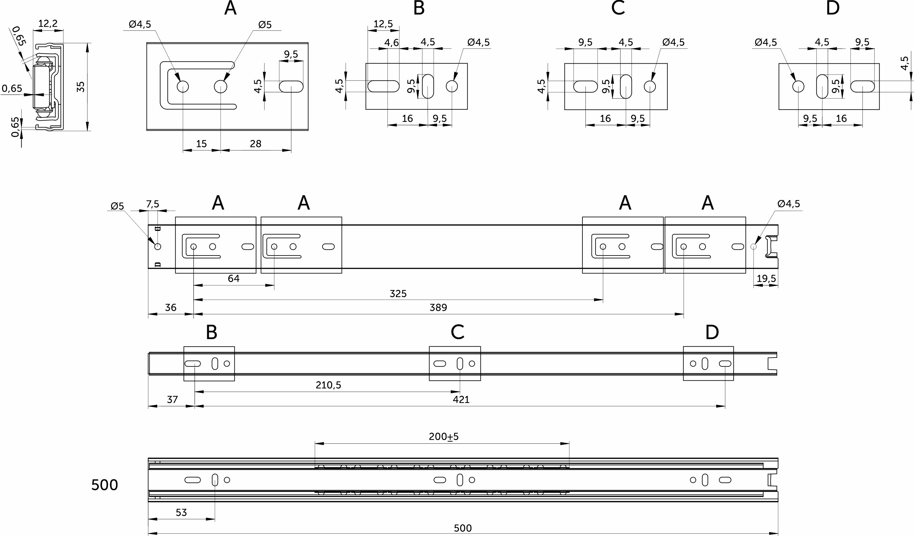 Направляющая для мебели GRIDLI изготовлена из холоднокатаной стали толщиной 0,65*0,65*0,65 мм, имеет резиновый фиксатор от самопроизвольного открытия. Фактическая высота данной направляющей 35 мм, а её длина – 500 мм.