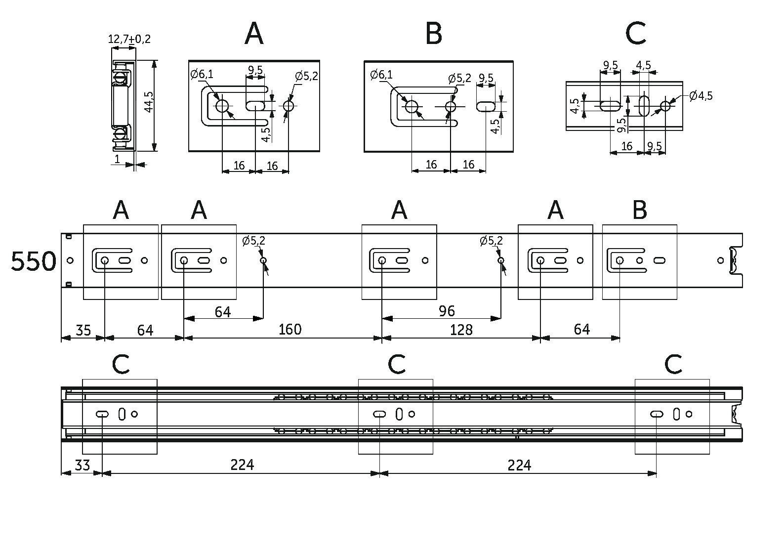 Направляющая шариковая L-550 h=45 PRIME by AKS A черный