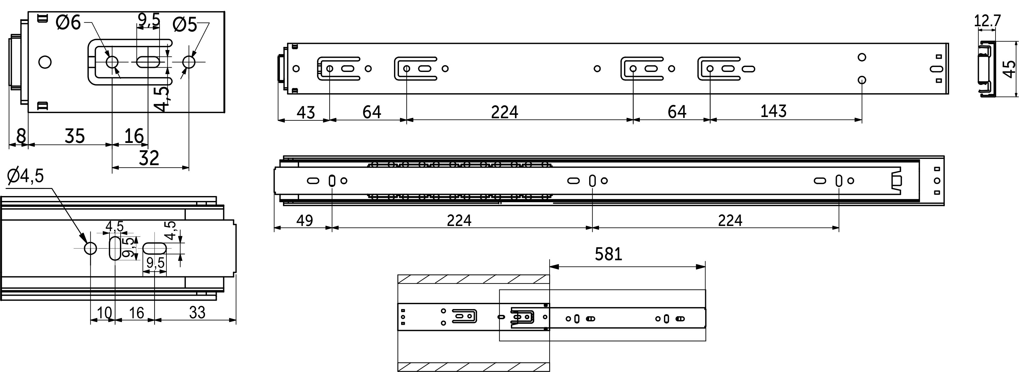 Направляющая высотой 45 мм оснащена системой отталкивания Push-to-open (открытие ящика от нажатия). Имеет усиленные толщины 1,2 / 1,4 из холоднокатаной стали. Направляющие рассчитаны на постоянную нагрузку в 25 кг со сроком службы 80 000 циклов. Имеют шарикоподшипниковые механизмы и телескопическую структуру, что обеспечивает полное выдвижение ящика. Для работы системы отталкивания необходим зазор в 6 мм. Доступные длины от 250 до 550 мм. Ширина ящика не должна превышать номинальную длину направляющей.