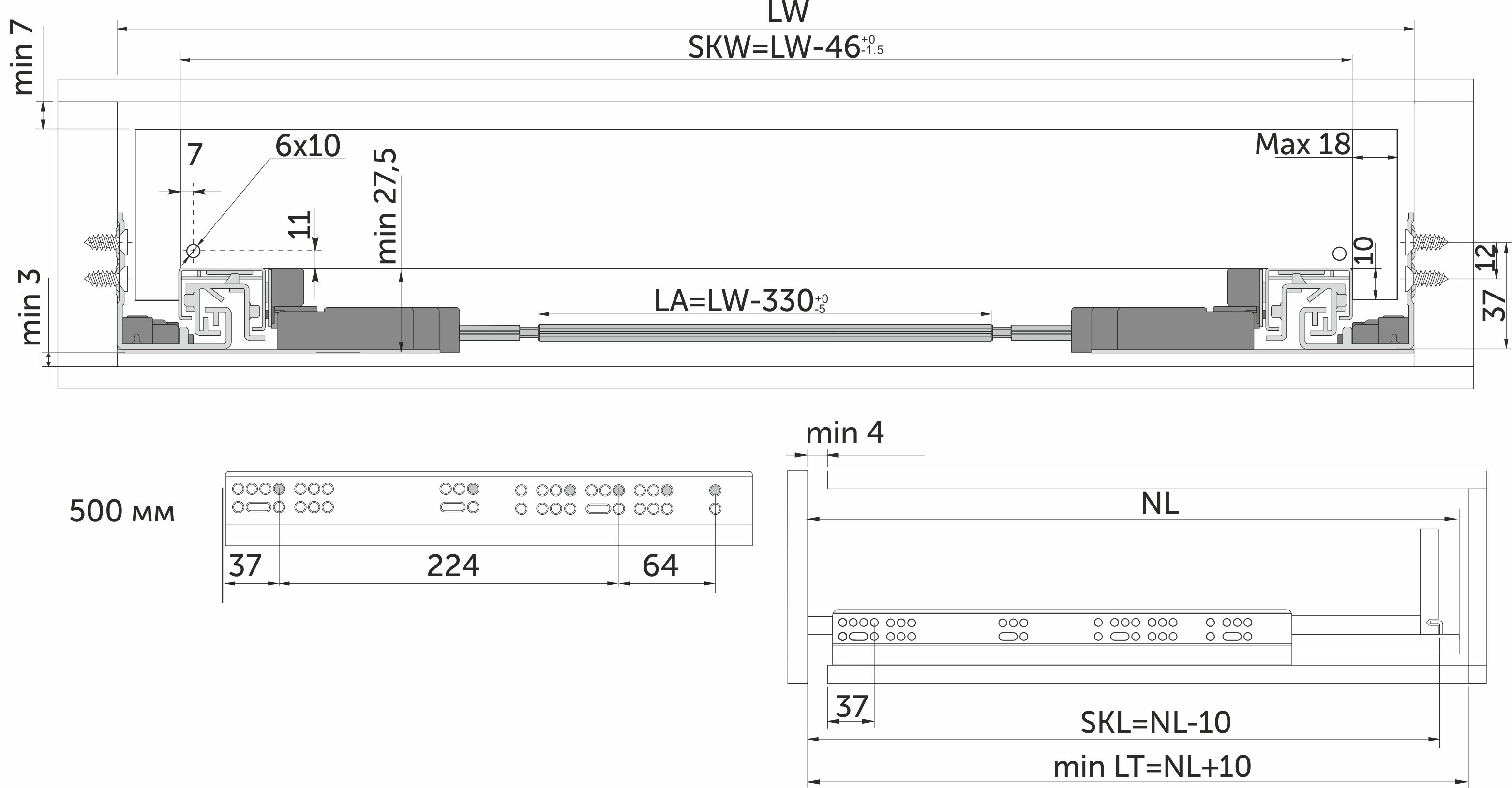 Направляющая скрытого монтажа L-500 push to open + доводчик ДСП до18mm с замками AKS SMART полное выдвижение