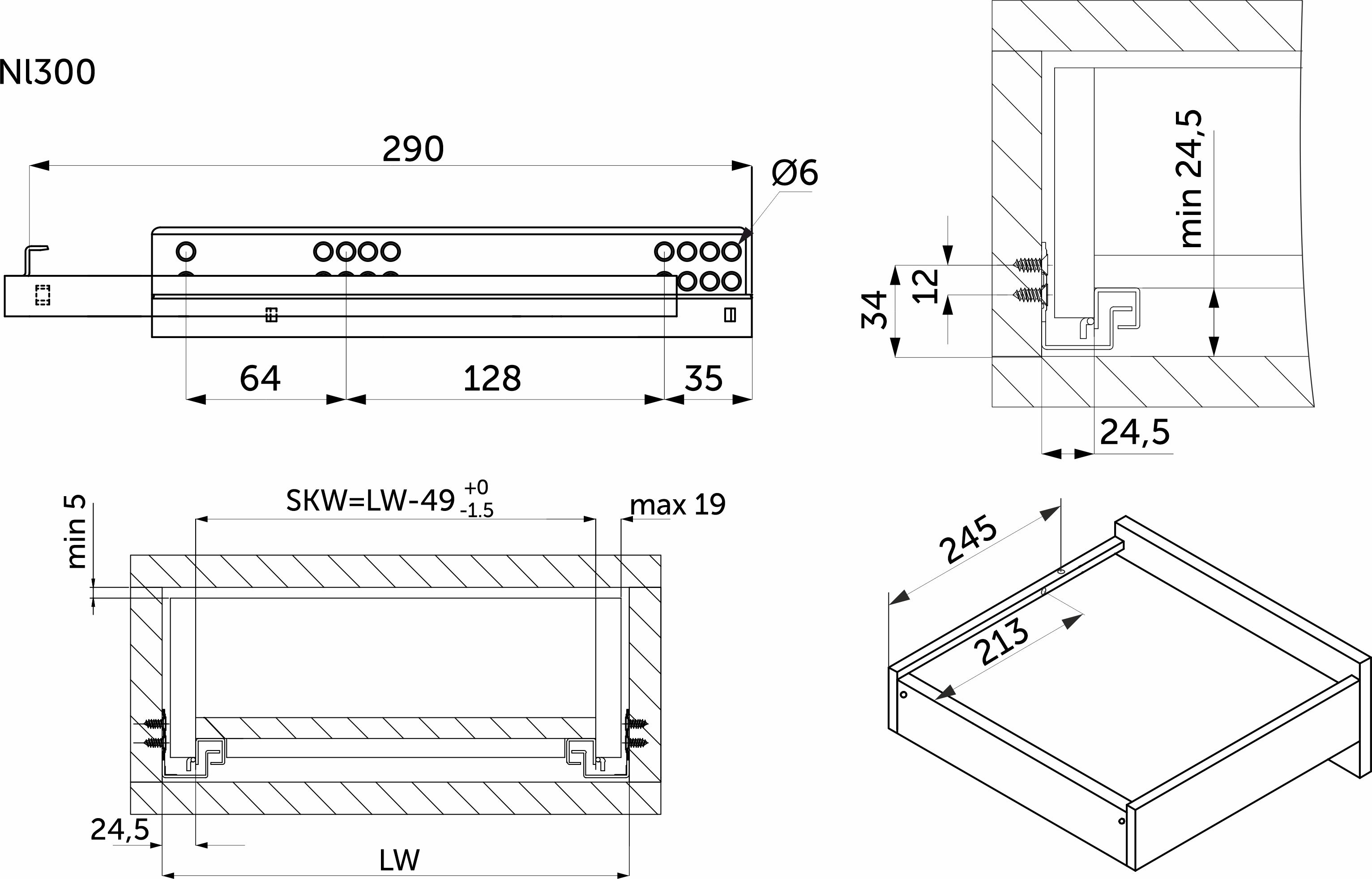 Направляющая скрытого монтажа L-300 с доводчиком ДСП до19mm насадной монтаж AKS 3/4 с фиксаторами