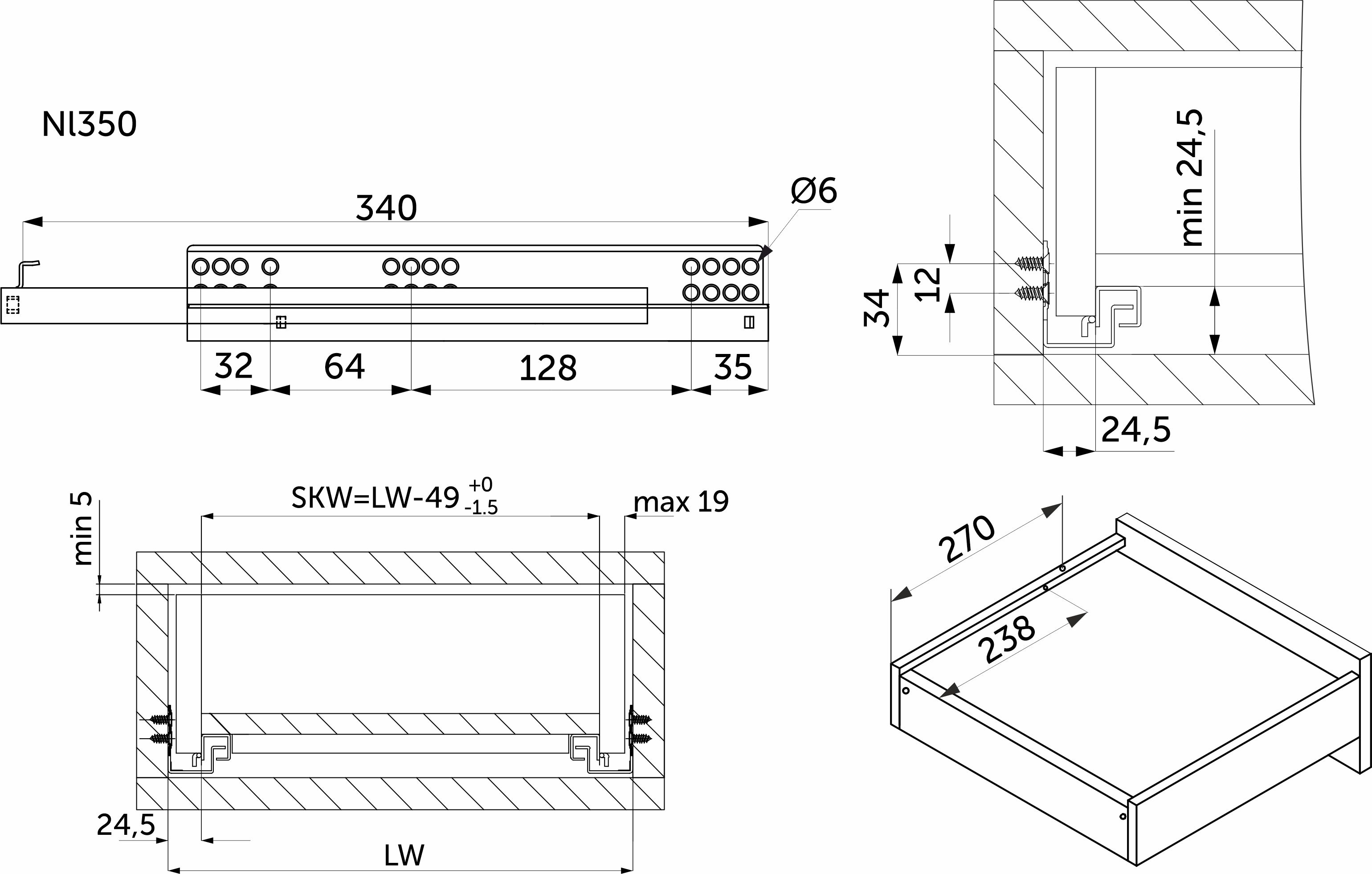 Направляющая скрытого монтажа L-350 с доводчиком ДСП до19mm насадной монтаж AKS 3/4 с фиксаторами