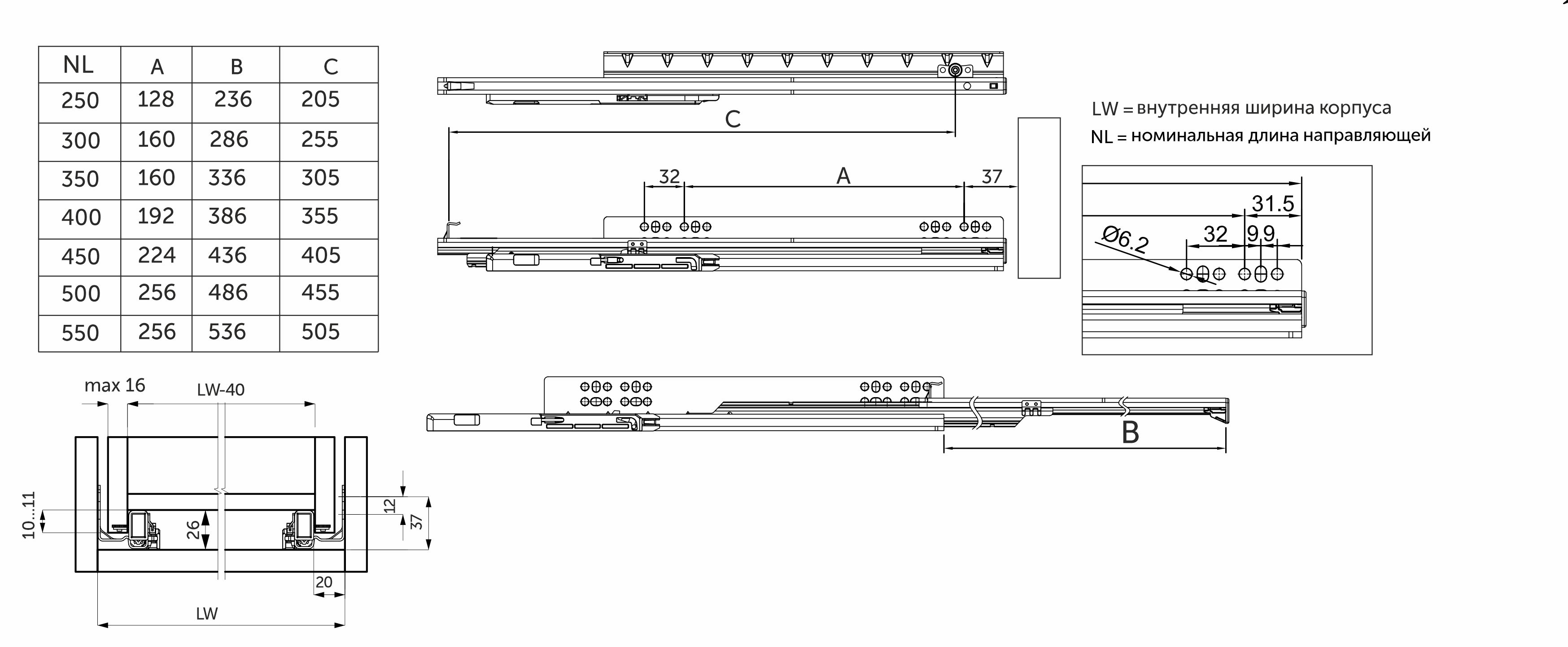 Направляющие предназначены для потайной (под ящиком) установки с минимальным зазором между стенкой корпуса и стенкой ящика (4 мм). Направляющая выполнена из прочной холоднокатаной стали, сепаратора с шарикоподшипником в нейлоновой оправе с ходом в полное выдвижение. Направляющие выполнены из оцинковоной стали, что позволяет их использовать в мебели для влажных комнат. Присутствует механизм доводчика. Минимальная потеря посадочной высоты ящика (22 мм). Данные направляющие идеально подходят для комодных систем, ящиков под ТВ-тумбы, мебели для ванных комнат. Рекомендуемая нагрузка - 30 кг. Регулировка по высоте: +/- 3 мм. Фиксация в закрытом состоянии от самопроизвольного открывания.