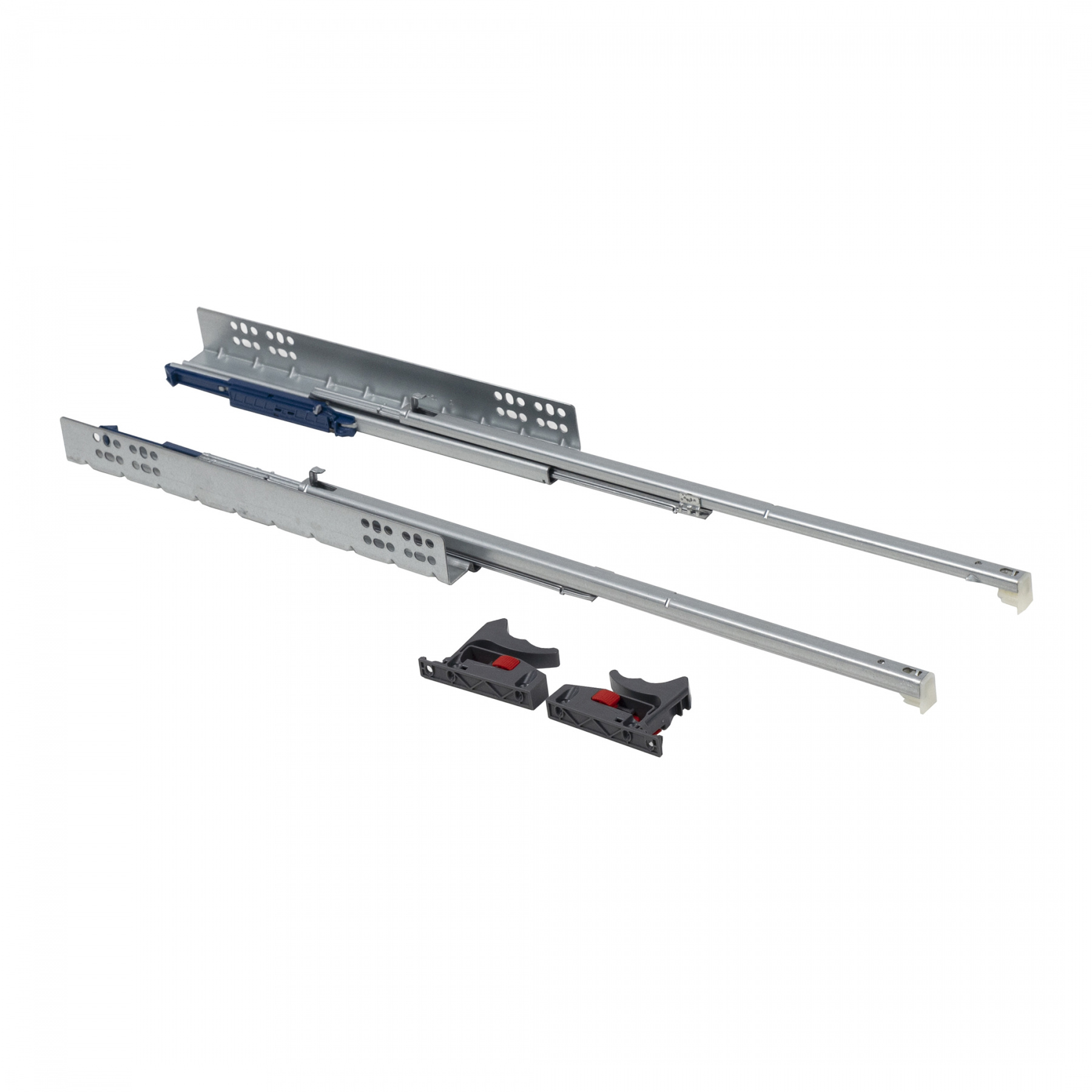 Направляющие предназначены для потайной (под ящиком) установки с минимальным зазором между стенкой корпуса и стенкой ящика (4 мм). Направляющая выполнена из прочной холоднокатаной стали, сепаратора с шарикоподшипником в нейлоновой оправе с ходом в полное выдвижение. Направляющие выполнены из оцинковоной стали, что позволяет их использовать в мебели для влажных комнат. Присутствует механизм открытия от нажатия (push-to-open). Минимальная потеря посадочной высоты ящика (22 мм). Данные направляющие идеально подходят для комодных систем, ящиков под ТВ-тумбы, мебели для ванных комнат. Рекомендуемая нагрузка - 30 кг. Регулировка по высоте: +/- 3 мм.