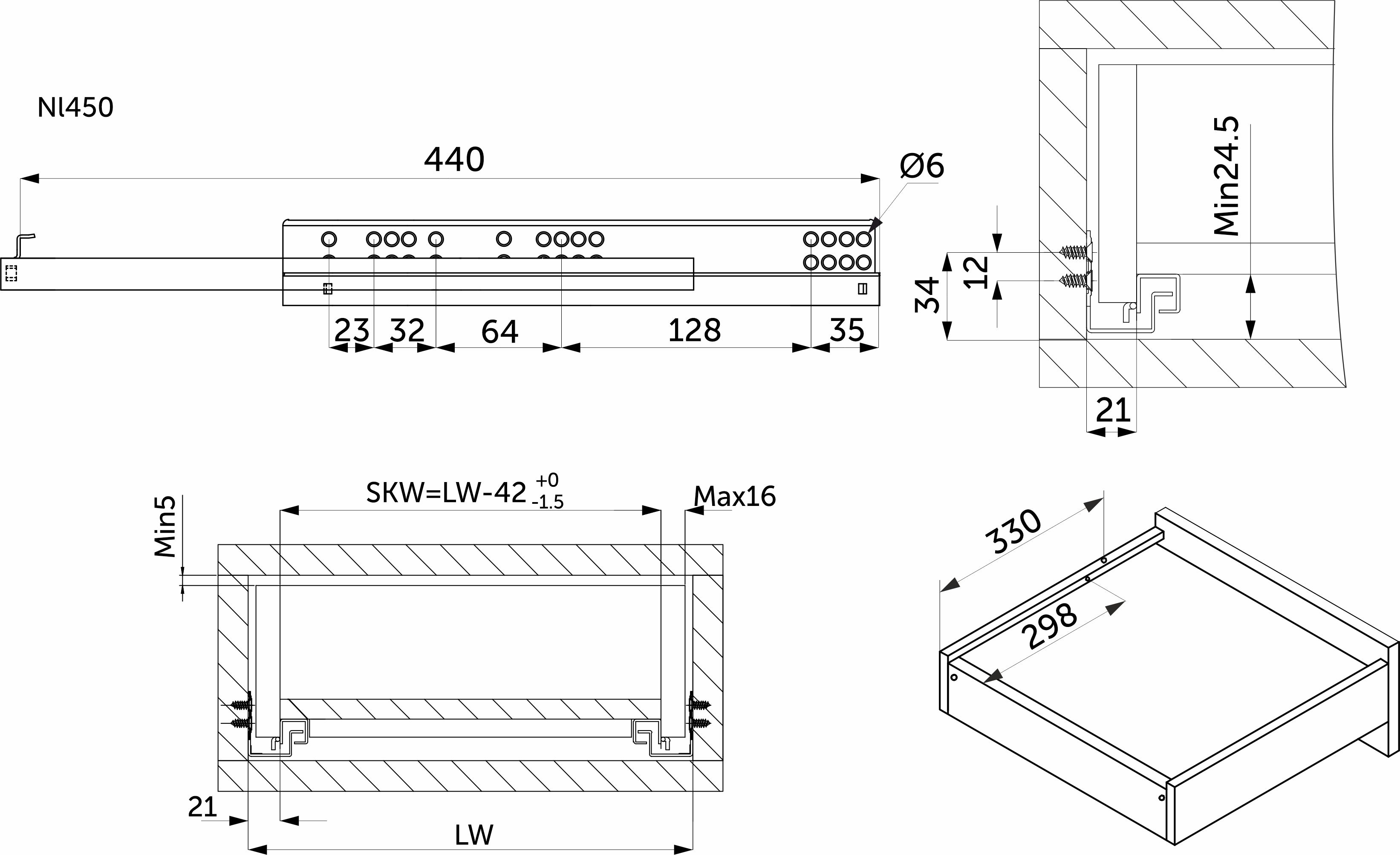Направляющая скрытого монтажа L-450 с доводчиком ДСП до16mm насадной монтаж AKS 3/4 с фиксаторами