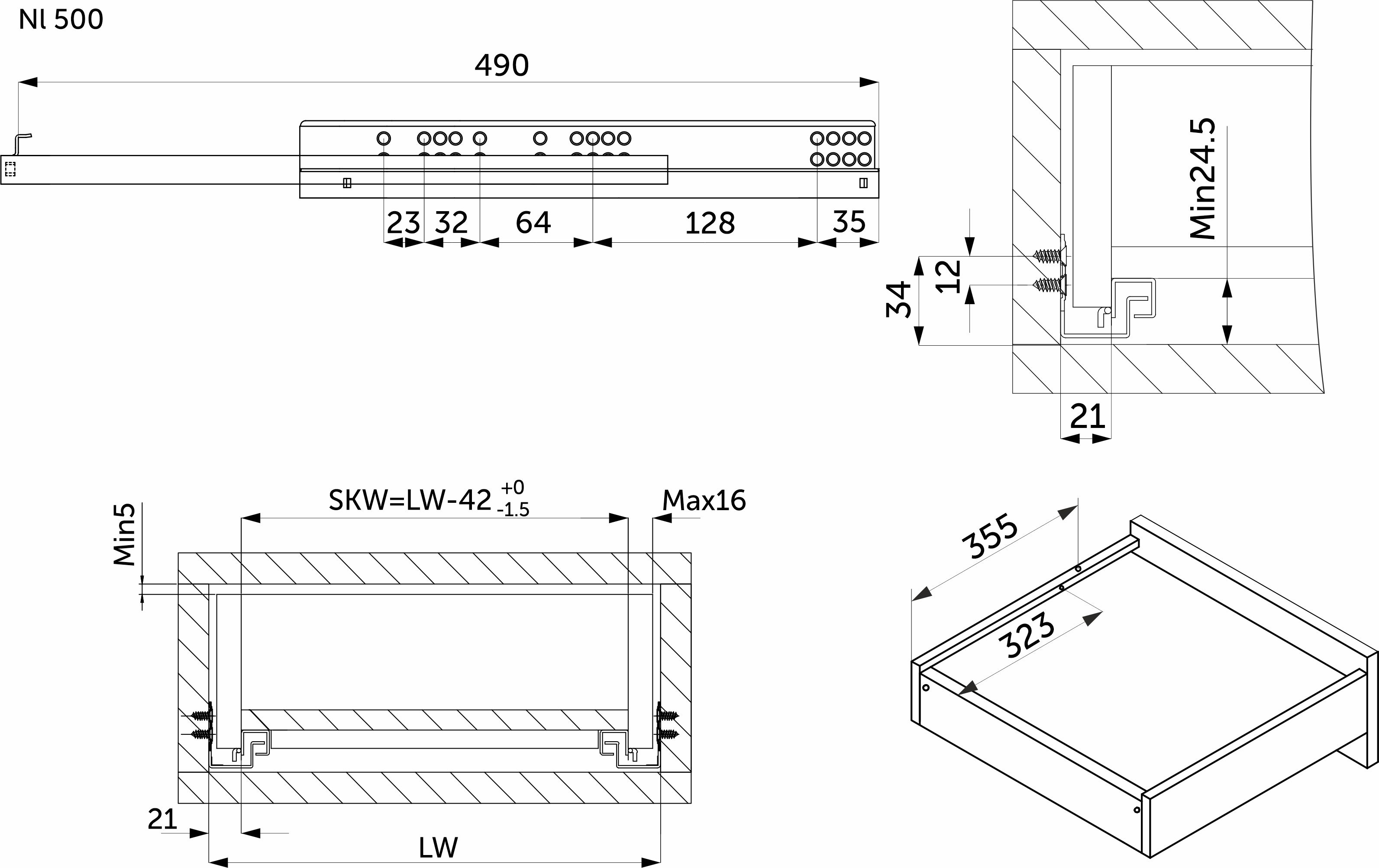 Направляющая скрытого монтажа L-500 с доводчиком ДСП до16mm насадной монтаж AKS 3/4 с фиксаторами