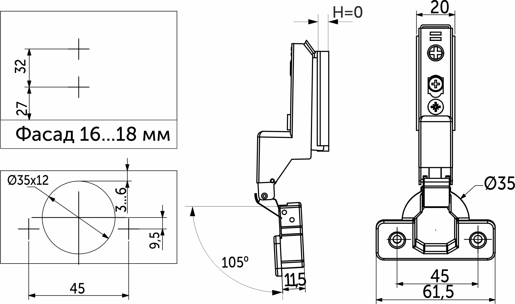 Петля внутренняя с доводчиком и системой быстрого монтажа clip on. Имеет современную систему регулировки в трех плоскостях по +/- 2 мм при помощи эксцентриковых винтов в планке и теле петли. Межцентровое расстояние в чашке 45 или 48 мм. Петля имеет массу 105 грамм и изготовлена из высокопрочной холоднокатаной стали. Имеет встроенный демпфер, что обеспечивает плавность закрытия петли. Имеет два угла открывания на 75 и 105 градусов. В комплекте идут декоративные накладки на тело и на чашку для маскировки винтов крепления. Особенностью является узкая ответная планка, которая обеспечивает эстетичный вид петли.
